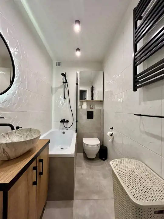 Łazienka jest nowoczesna i zadbana, wyposażona w wannę, co daje możliwość zarówno szybkiego prysznica, jak i relaksującej kąpieli.