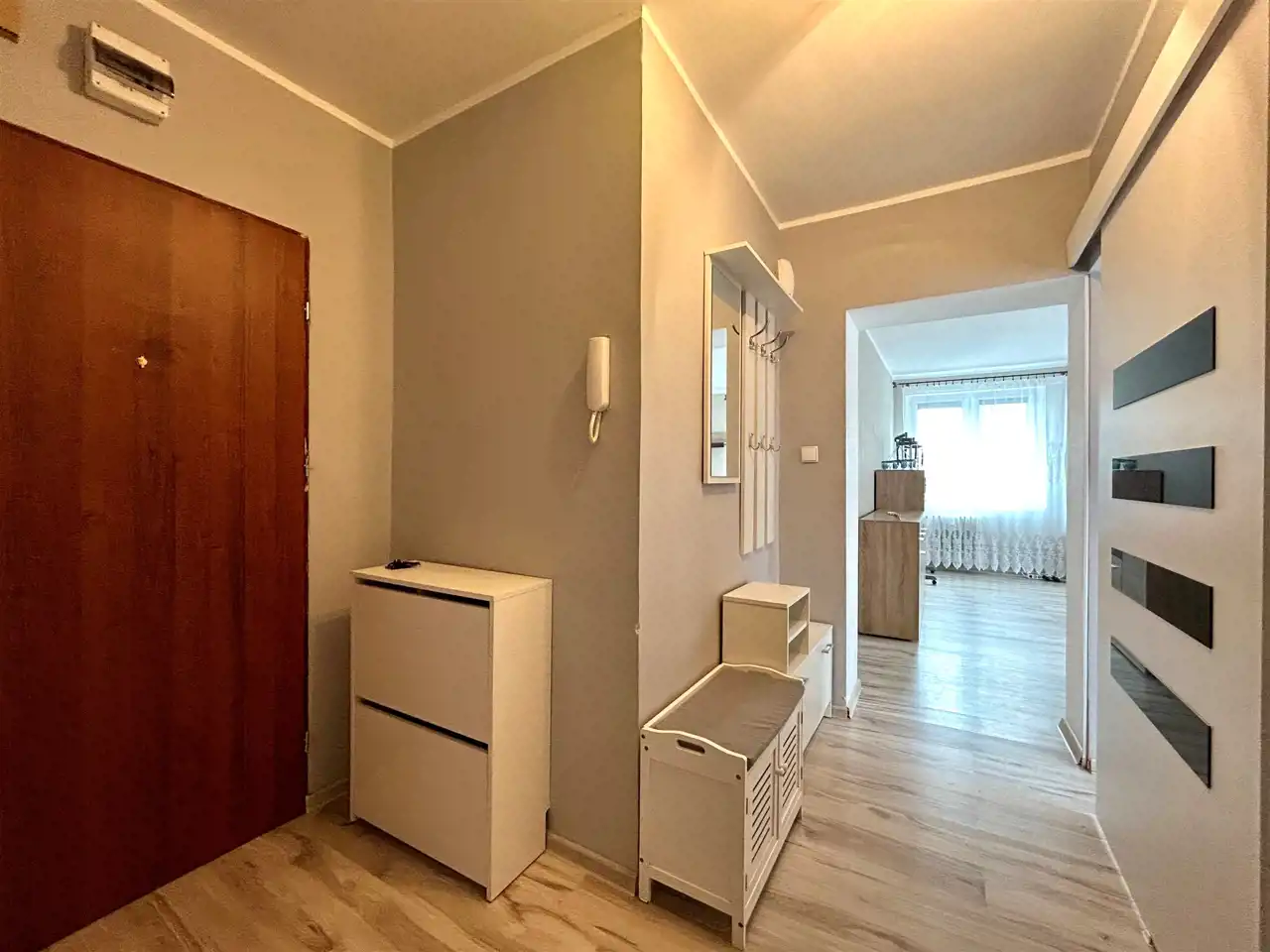 W przedpokoju znajdują się meble oraz wieszak, co ułatwia organizację przestrzeni.