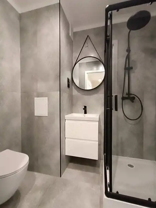• Łazienkę – elegancką, z kabiną prysznicową, wykończoną stylową glazurą