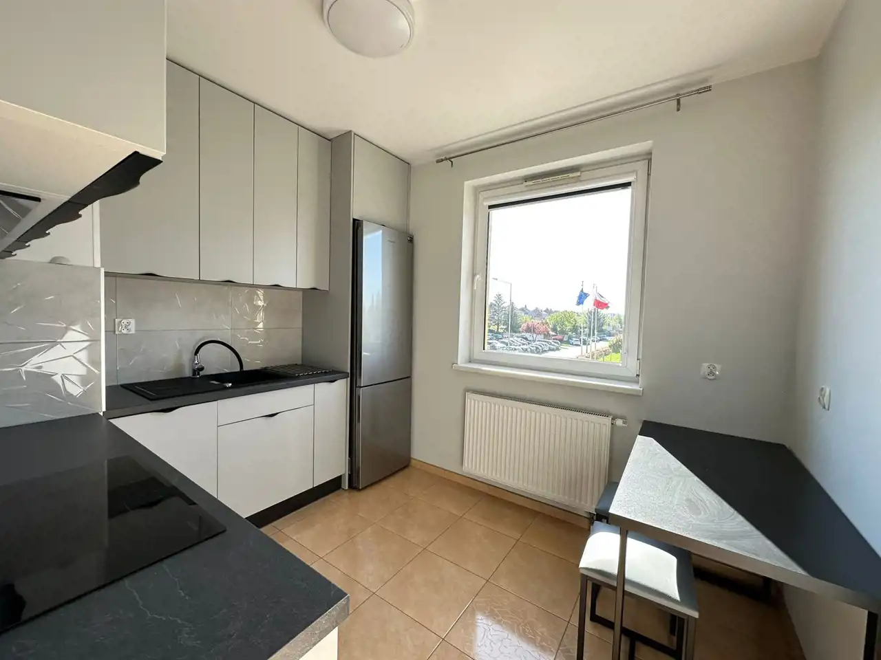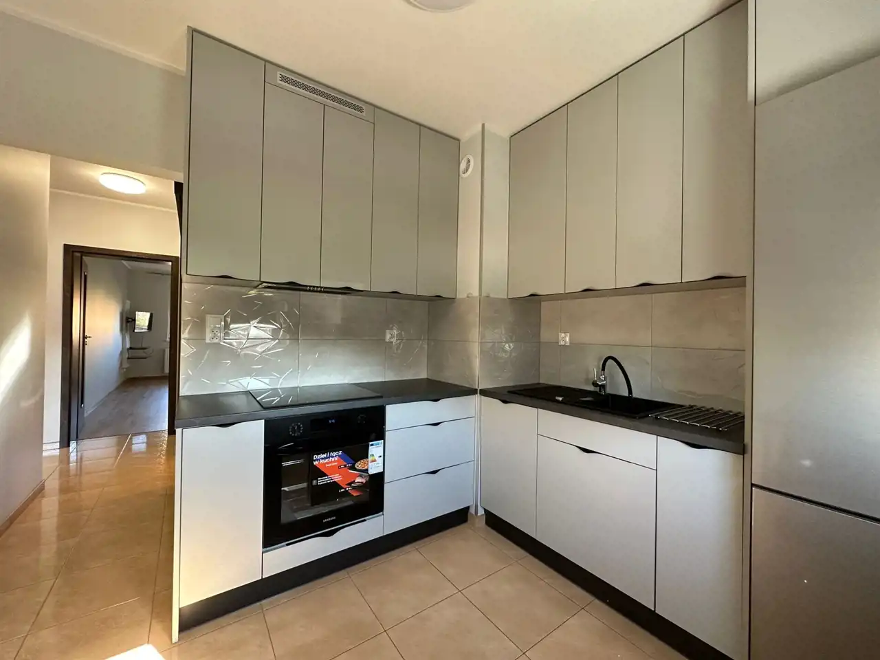 kuchnia z nowymi meblami i sprzętem AGD (płyta indukcyjna, piekarnik, lodówka, zmywarka)