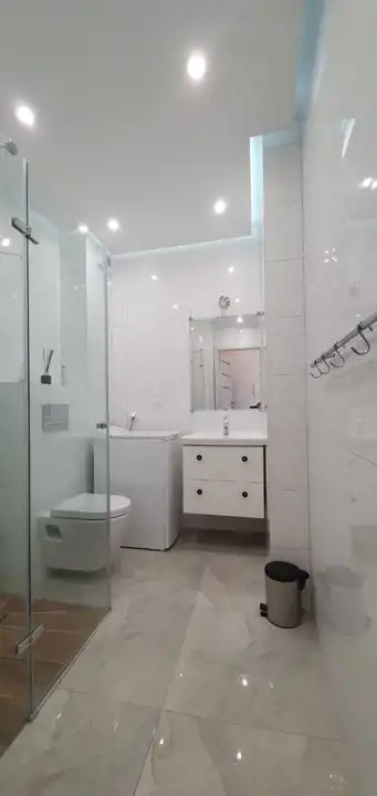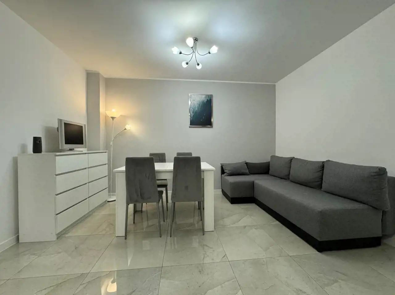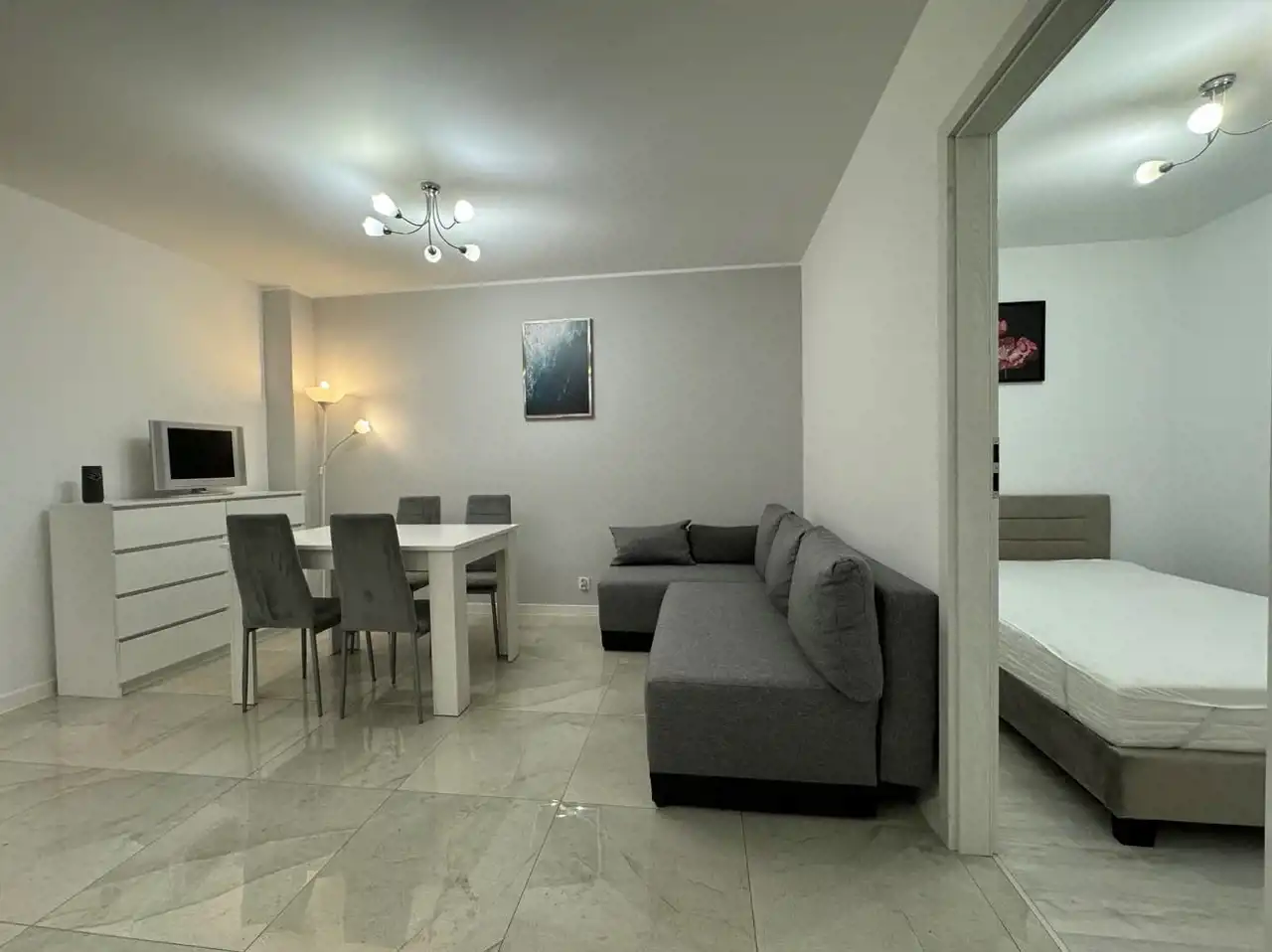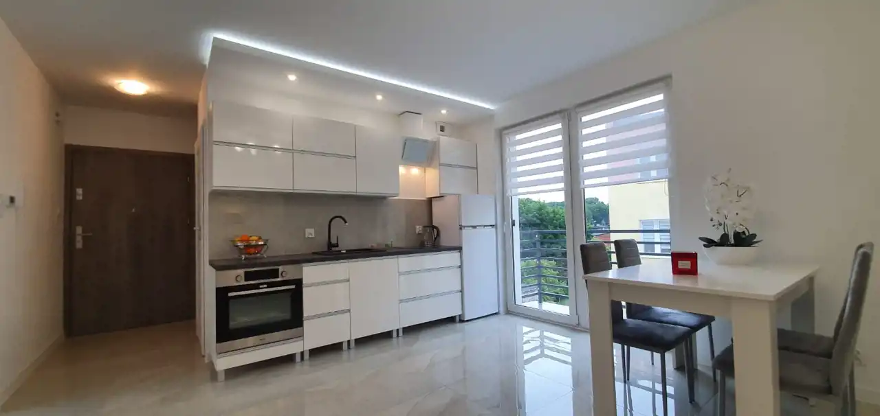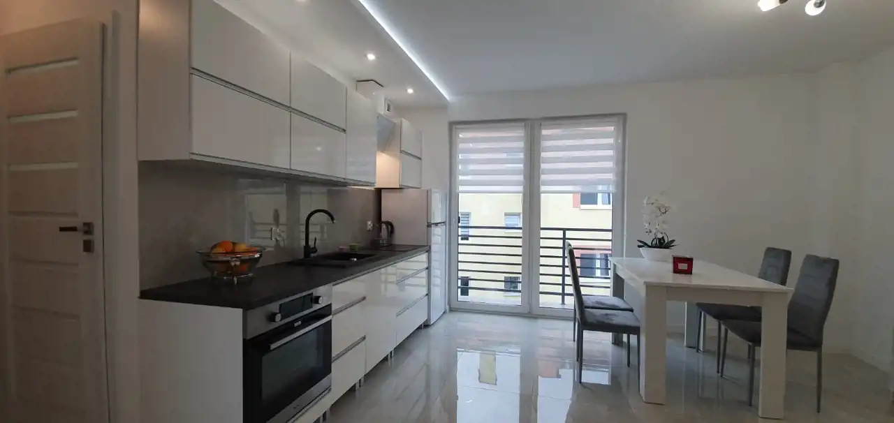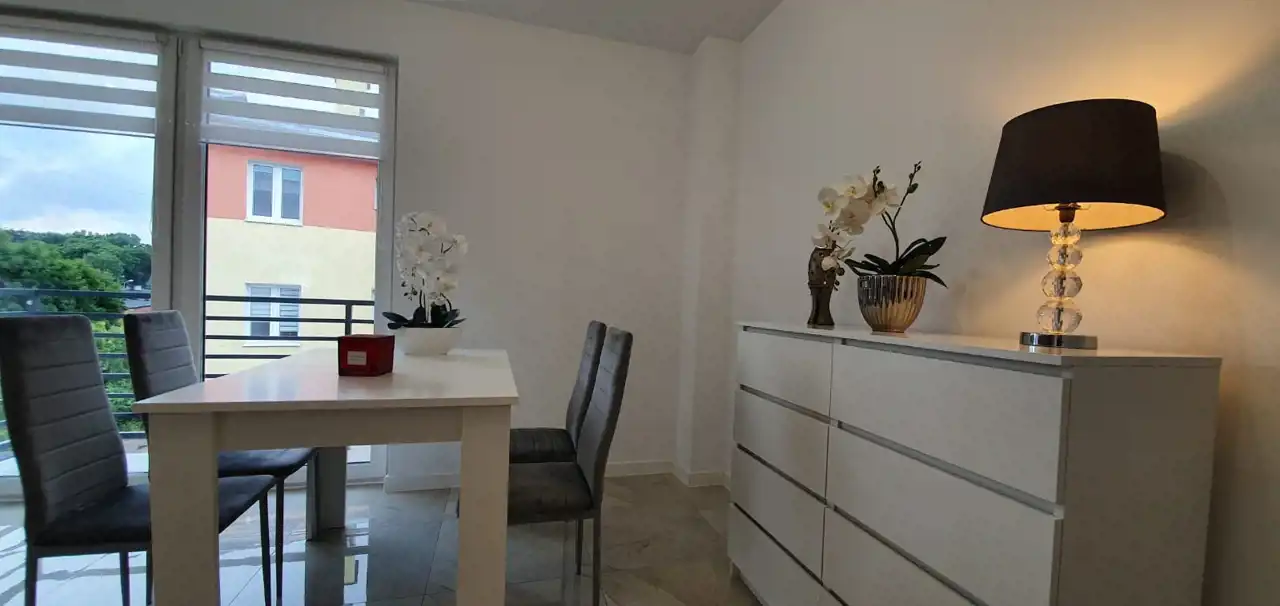 Biuro nieruchomości BAJ HOME oferuje Państwu 3-pokojowe, nowoczesne, umeblowane mieszkanie z przynależącą komórką lokatorską i miejscem parkingowym na terenie zamkniętym. Całkowita powierzchnia nieruchomości wynosi 40,09 m2. Mieszkanie jest usytuowane na 3 piętrze budynku wielorodzinnego, który wybudowano w 2020r. na Osiedlu Słonecznym przy ul. Droga Łąkowa w Grudziądzu. Składa się ono z salonu z aneksem kuchennym o pow. 17,78 m2, pokoju o pow. 6,90 m2, pokoju o pow. 6,90 m2, przedpokoju o pow. 2,75 m2 i łazienki 4,04 m2 oraz komórki lokatorskiej o pow. 1,72 m2. Nieruchomość posiada również duży, wyłożony kaflami balkon, którego powierzchnia wynosi 4,40 m2. Mieszkanie jest zlokalizowane w nowym budynku mieszkalnym i posiada pełne wyposażenie. Na podłodze w łazience, przedpokoju oraz salonie z aneksem zostały położone duże kafle na wysoki połysk o rozmiarach 60x60 cm. W kolejnych pokojach na podłodze zamontowano panele. Ściany pokoi pokryto gładziami, które pomalowano białą farbą, a w łazience położono kafle. W zabudowie aneksu kuchennego do dyspozycji wynajmującego jest płyta indukcyjna, pochłaniacz i piekarnik elektryczny firmy Amica oraz lodówka z zamrażarką. Nad aneksem kuchennym zamontowano doświetlany ledowo z góry, podwieszany sufit z oświetleniem halogenowym Spotlight. Na wyposażeniu salonu znajduje się również narożna kanapa, komoda i stół z 4 krzesłami oraz telewizor. We wszystkich oknach zawieszono funkcjonalne rolety dzień – noc. Jeden z pokoi idealnie nadaje się na garderobę, gdyż wstawiono tam dużą, pojemną szafę oraz komodę. Do dyspozycji lokatorów przygotowano odkurzacz, telewizor, pościel, a aneks kuchenny jest wyposażony w wiele nowych naczyń zarówno do przygotowania, jaki i spożywania posiłków. W łazience zamontowano kabinę prysznicową z odpływem liniowym, umywalkę wraz z szafką oraz nową pralkę. W całym mieszkaniu zainstalowane zostało ogrzewanie podłogowe, sterowane termostatem firmy Viessmann. Budynek, w jakim znajduje się mieszkanie jest ogrodzony, z bramą elektryczną na pilota i furtką z domofonem, co zwiększa poziom bezpieczeństwa najemców. Dodatkowo sąsiedni budynek posiada monitoring skierowany również na oferowaną nieruchomość.