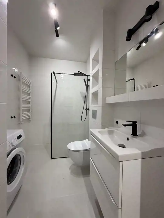 - Łazienka – elegancka, wyposażona w nowoczesny prysznic oraz pralkę.