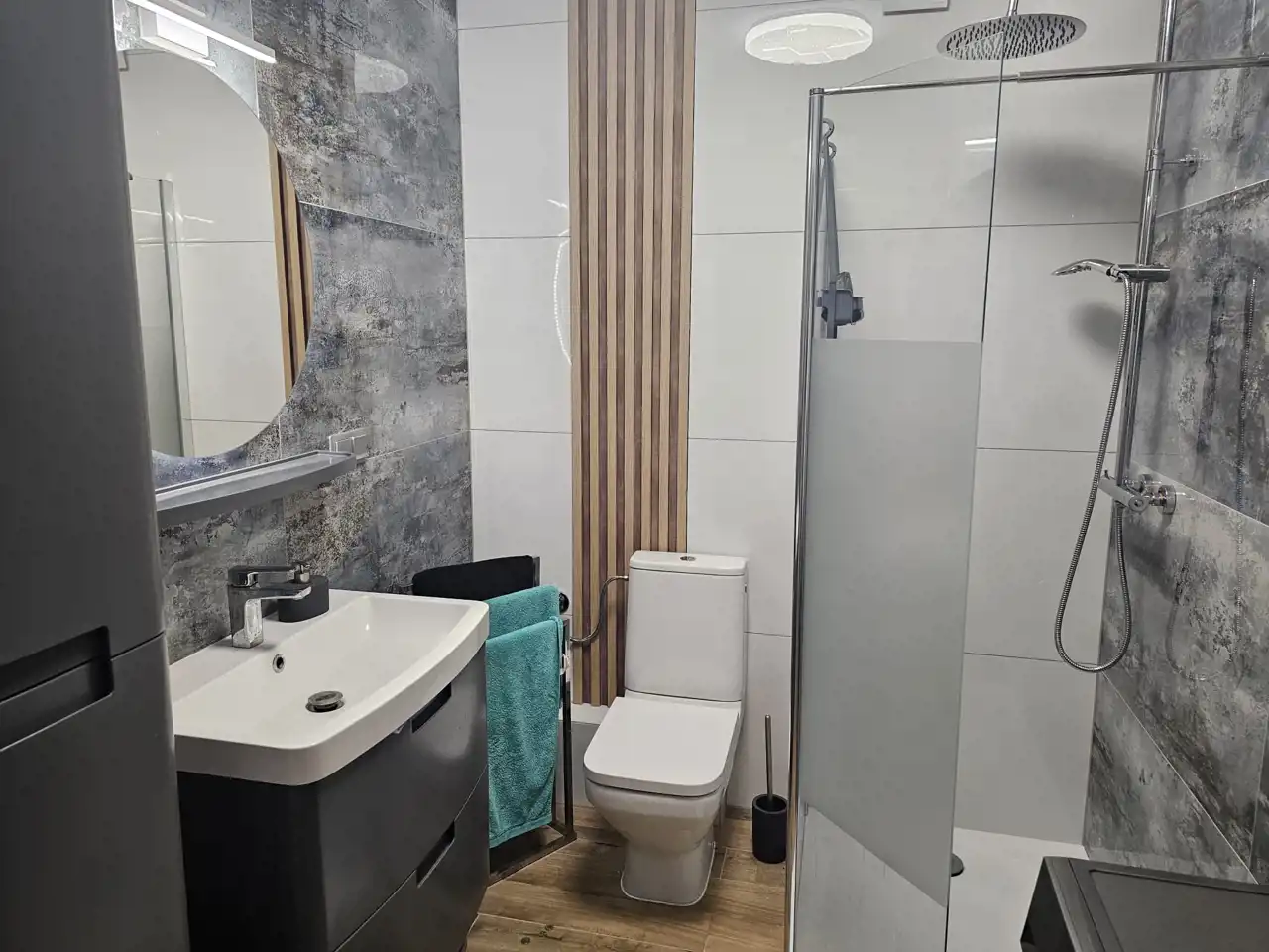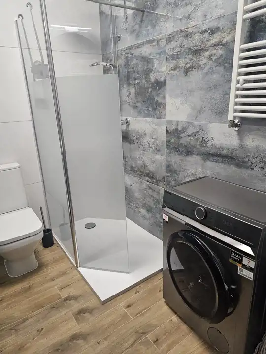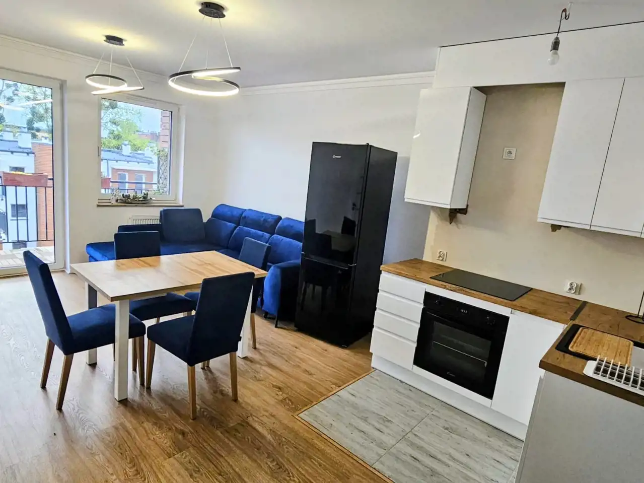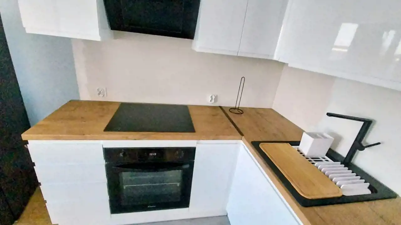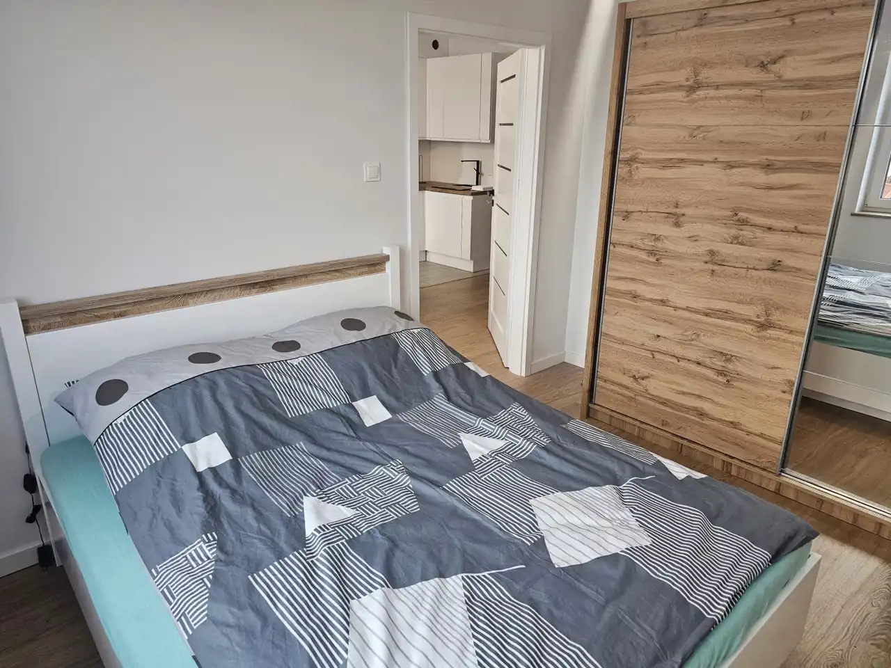 Mieszkanie jest umeblowane. W dużym pokoju jest narożna kanapa z funkcją spania, rozsuwany stół, 4 krzesła. Aneks kuchenny wyposażony jest w meble, kuchenkę indukcyjną, piekarnik, okap, lodówkę z zamrażarką. W sypialni mamy szerokie łóżko i szeroką trzydrzwiową szafę. W sporej łazience oprócz szafek, umywalki i wc jest szeroka kabina prysznicowa oraz pralka.