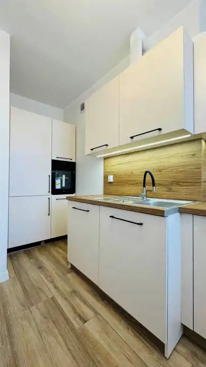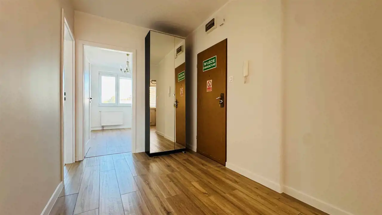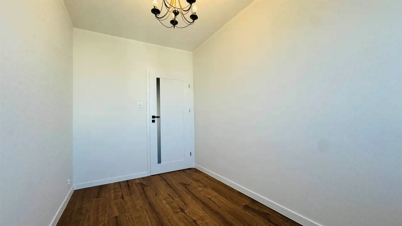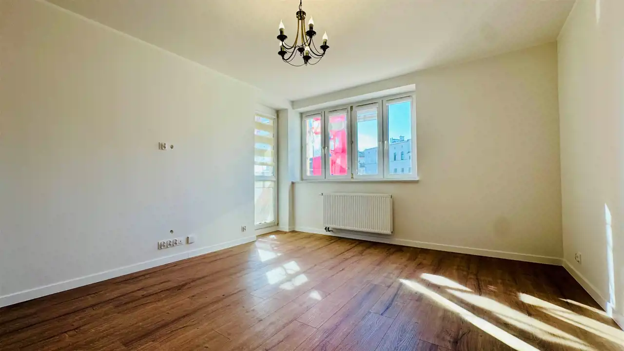 Widna, umeblowana kuchnia została wyposażona w wysokiej jakości, nowy sprzęt w zabudowie: lodóko-zamrażarkę, płytę indukcyjną i zmywarkę (wszystkie Amica), piekarnik elektryczny Xberg oraz okap. Stylowe połączenie kolorów frontów zabudowy z białymi ścianami świetnie podkreśla walory estetyczne, które dodatkowo potęgowane są przez światło wpadające do kuchni. Duża, ustawna łazienka wyposażona została w kabinę prysznicową, nową misę sedesową wraz z wolnoopadającą deską i pojemną szafę. Okna nieruchomości zostały wyposażone w rolety materiałowe typu dzień-noc. Dodatkowo wymieniono drzwi wewnętrzne wraz z ościeżnicami, odmalowano ściany, położono nowe podłogi oraz wstawiono wysokiej jakości parapety z konglomeratu. Do nieruchomości doprowadzono również światłowód z Orange. Prócz przedpokoju, w którym znajduje się druga, funkcjonalna szafa, pomieszczenia są puste, dając możliwość wstawienia własnych mebli. Istnieje jednak możliwość doposażenia mieszkania przez właściciela po uprzednich ustaleniach.