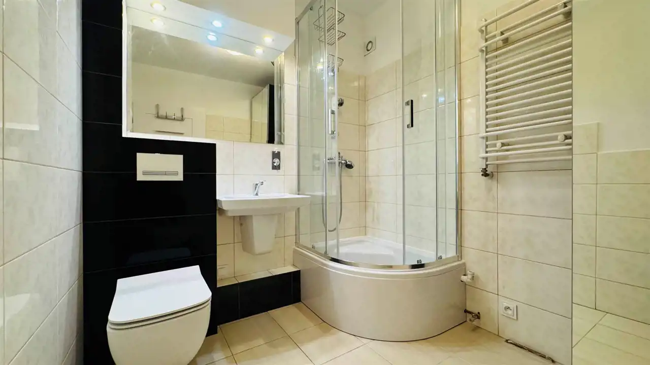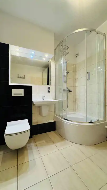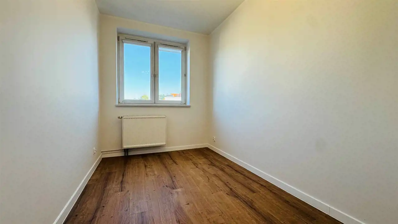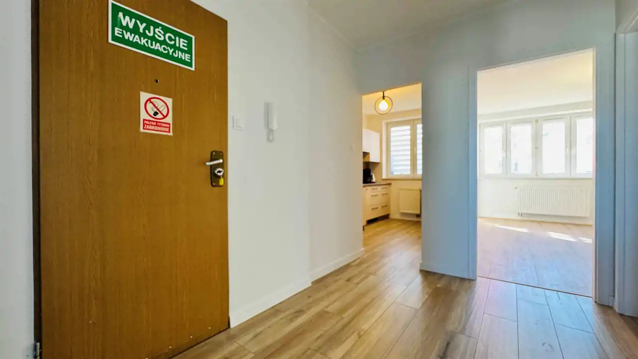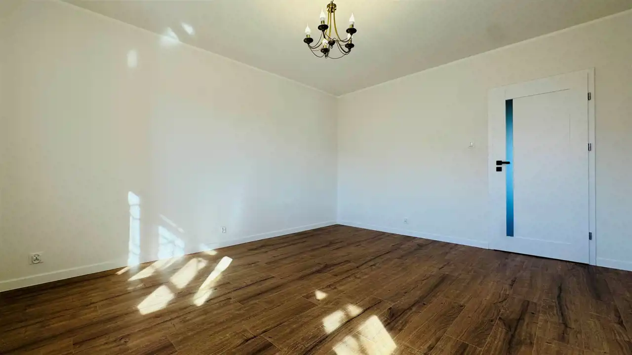 Widna, umeblowana kuchnia została wyposażona w wysokiej jakości, nowy sprzęt w zabudowie: lodóko-zamrażarkę, płytę indukcyjną i zmywarkę (wszystkie Amica), piekarnik elektryczny Xberg oraz okap. Stylowe połączenie kolorów frontów zabudowy z białymi ścianami świetnie podkreśla walory estetyczne, które dodatkowo potęgowane są przez światło wpadające do kuchni. Duża, ustawna łazienka wyposażona została w kabinę prysznicową, nową misę sedesową wraz z wolnoopadającą deską i pojemną szafę. Okna nieruchomości zostały wyposażone w rolety materiałowe typu dzień-noc. Dodatkowo wymieniono drzwi wewnętrzne wraz z ościeżnicami, odmalowano ściany, położono nowe podłogi oraz wstawiono wysokiej jakości parapety z konglomeratu. Do nieruchomości doprowadzono również światłowód z Orange. Prócz przedpokoju, w którym znajduje się druga, funkcjonalna szafa, pomieszczenia są puste, dając możliwość wstawienia własnych mebli. Istnieje jednak możliwość doposażenia mieszkania przez właściciela po uprzednich ustaleniach.