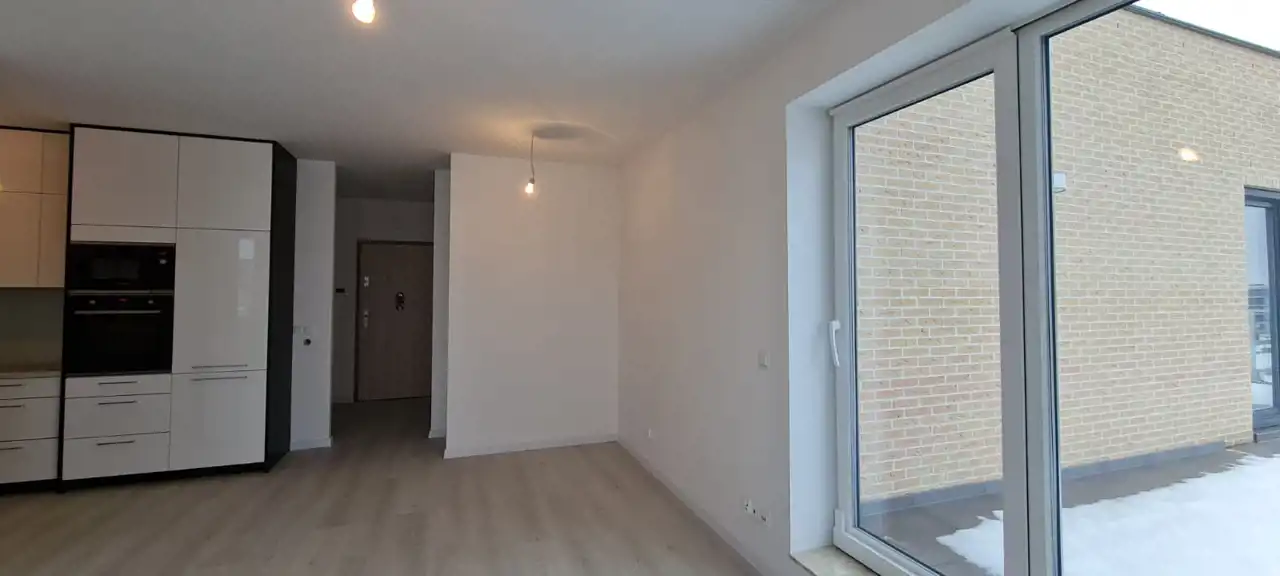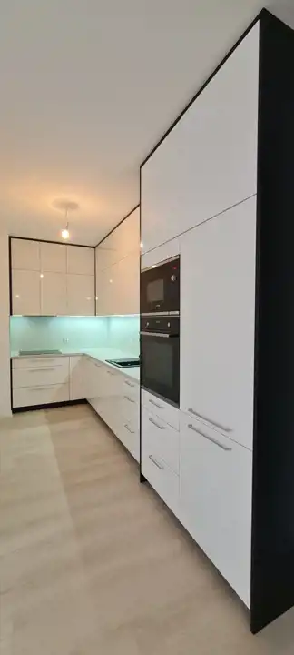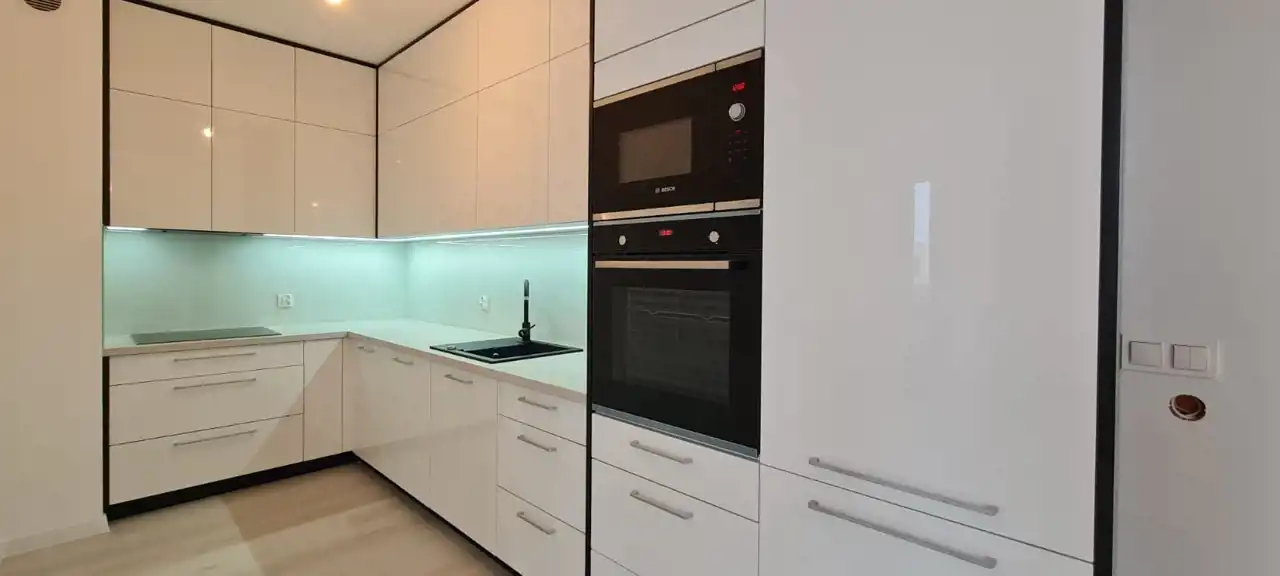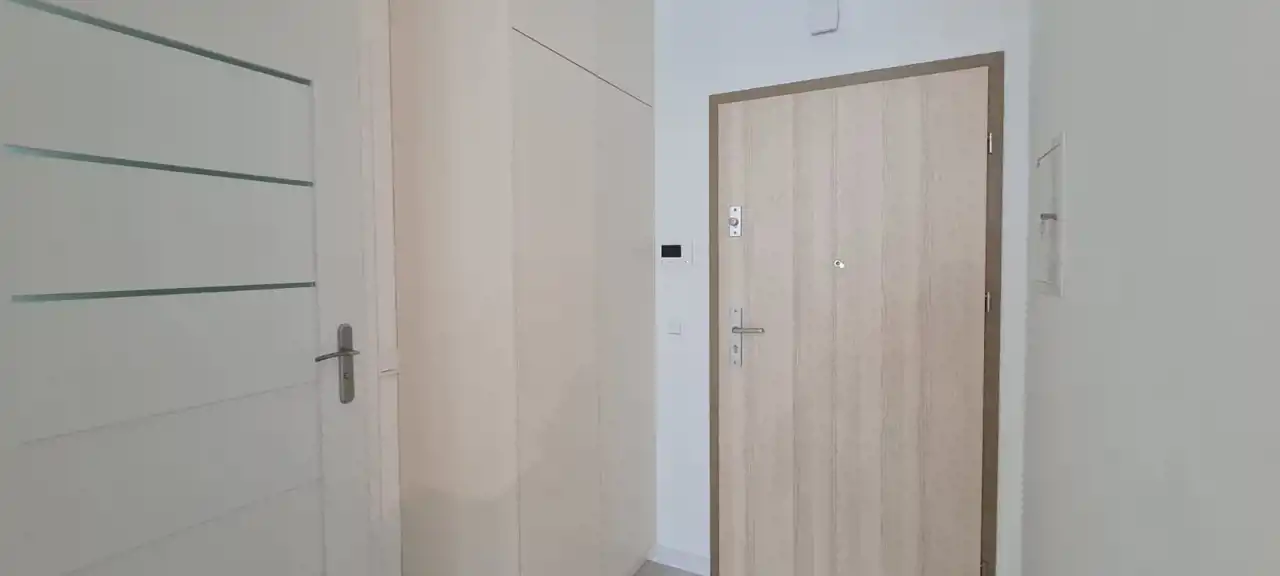 Na podłogach położone są panele podłogowe w jasnym kolorze, natomiast ściany pokryto gładzią i pomalowano farbą w kolorze bieli. Neutralny kolor w pomieszczeniach daje możliwość zaprojektowania pomieszczeń dodatkami w dowolnej kolorystyce. Efektowna, w kolorze białym, lakierowana na wysoki połysk kuchnia w zabudowie, stanowiąca serce domu, wygląda rewelacyjnie i doskonale wpasowuje się w nowoczesny klimat mieszkania. Została ona wyposażona w niezbędny sprzęt AGD: piekarnik, płytę indukcyjną, pochłaniacz, zmywarkę oraz lodówko-zamrażarkę. Nowoczesna i stylowa łazienka pokryta została kaflami w białym kolorze i wyposażona w nowoczesną szklaną kabinę prysznicową, zlew z szafkę oraz toaletę. Do oświetlenia łazienki wykorzystano nowoczesne oświetlenie w podwieszanym suficie oraz listwy led. Dużym atutem mieszkania jest przestronny, bardzo duży taras, z którego rozciąga się ładny widok panoramę osiedla i doliny Wisły. W przedpokoju usytuowana została pojemna szafa w zabudowie. Bezpieczeństwo mieszkańcom zapewniają antywłamaniowe drzwi wejściowe oraz videofon.