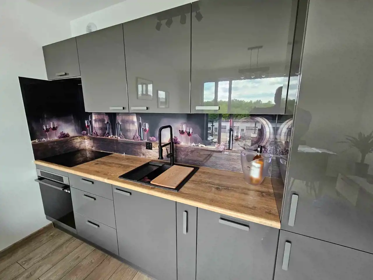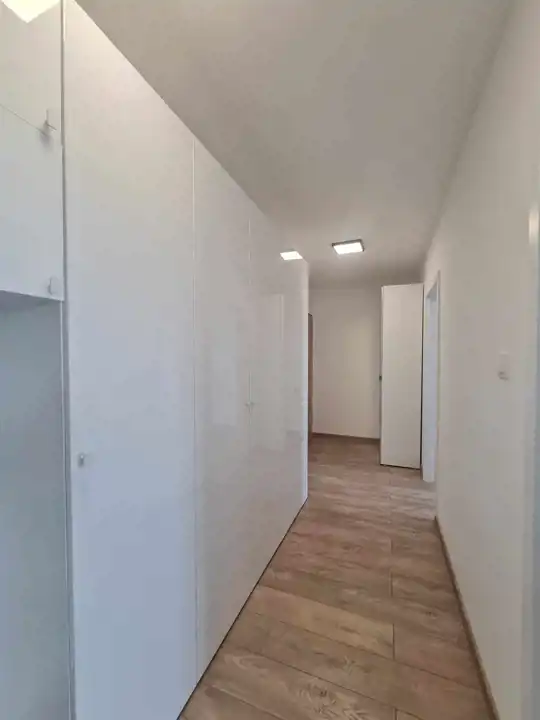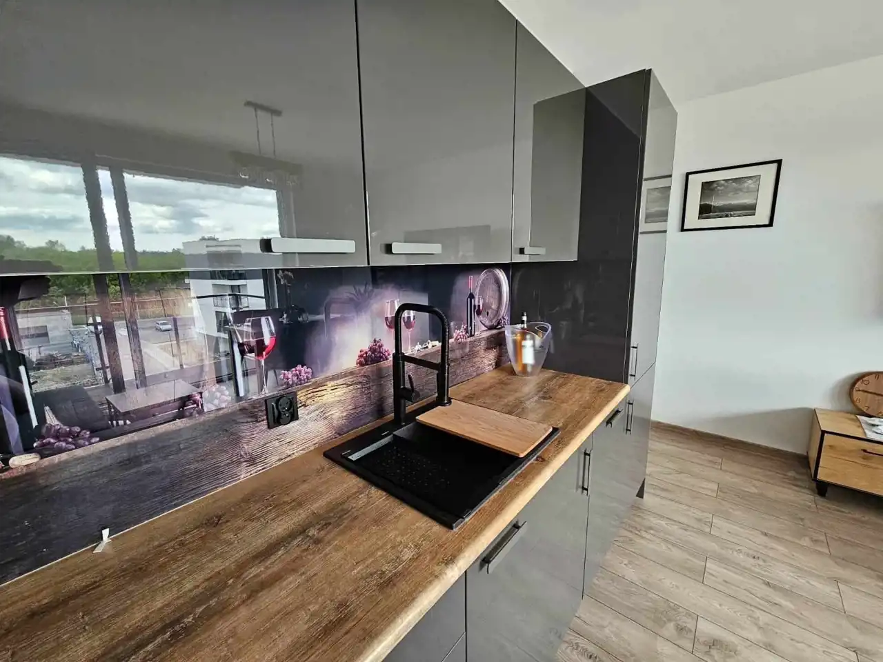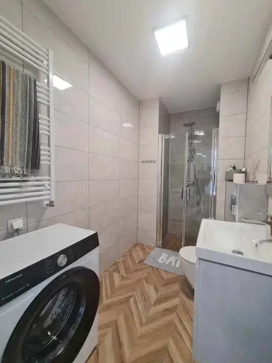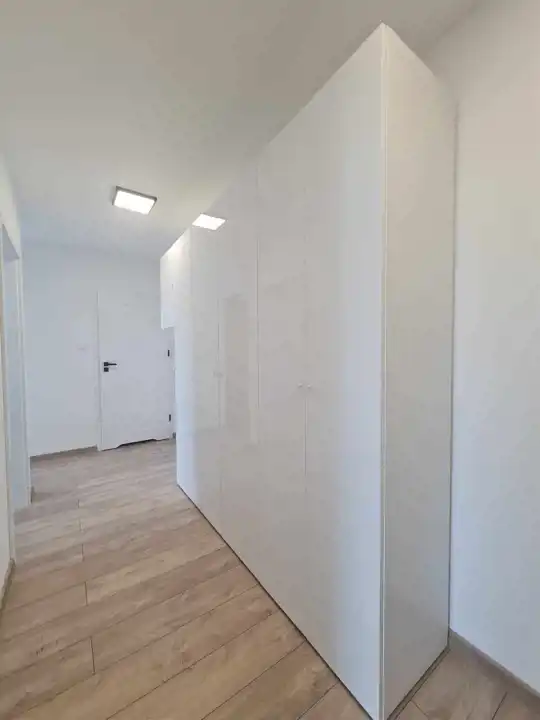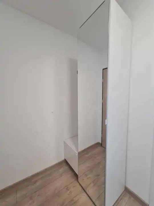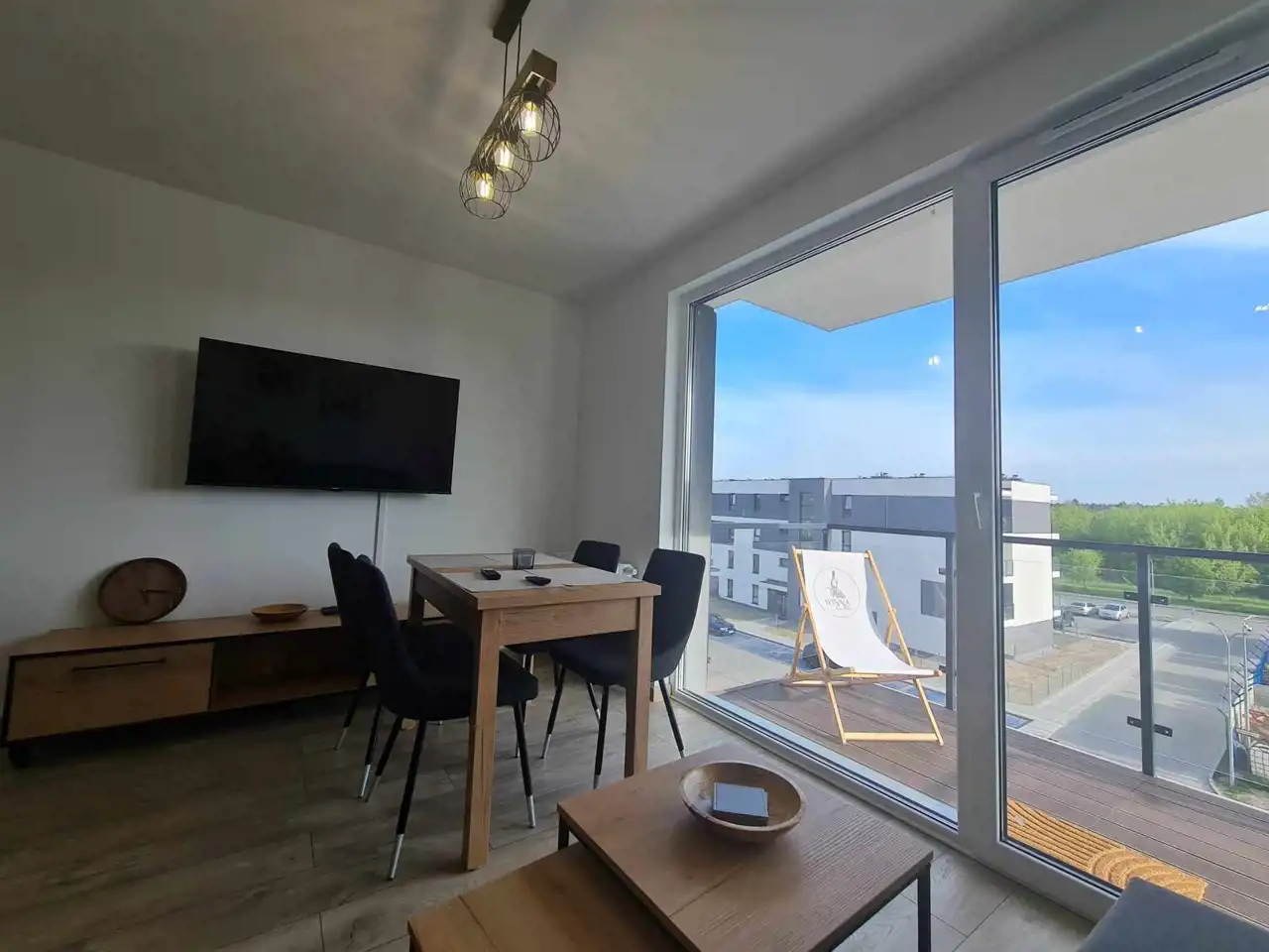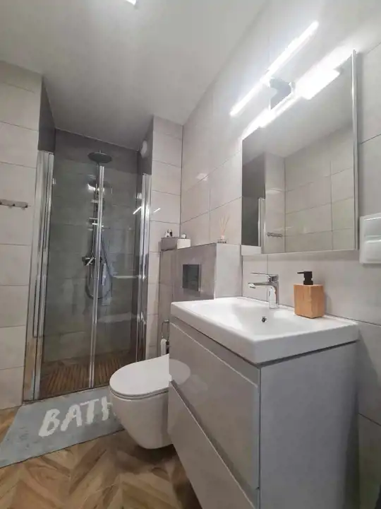 Mieszkanie zostało nowocześnie zaaranżowane i jest bardzo funkcjonalne. W salonie znajduje się aneks kuchenny wyposażony w lakierowane meble kuchenne. Do dyspozycji najemców jest lodówko-zamrażarka, piekarnik, płyta indukcyjna i zmywarka. Salon wyposażono w kanapę, stół z krzesłami, stolik kawowy i komodę rtv oraz telewizor. Jedną z sypialni wyposażono w dwuosobowe łóżko, natomiast w drugiej wstawiono łóżko (które nie jest widoczne na zdjęciach). W łazience wyposażonej w prysznic, umywalkę, wc oraz pralkę, położono kafle. W przedpokoju wstawiono olbrzymią białą szafę oraz również białą zabudowę z szafą z lustrem oraz wieszakami.