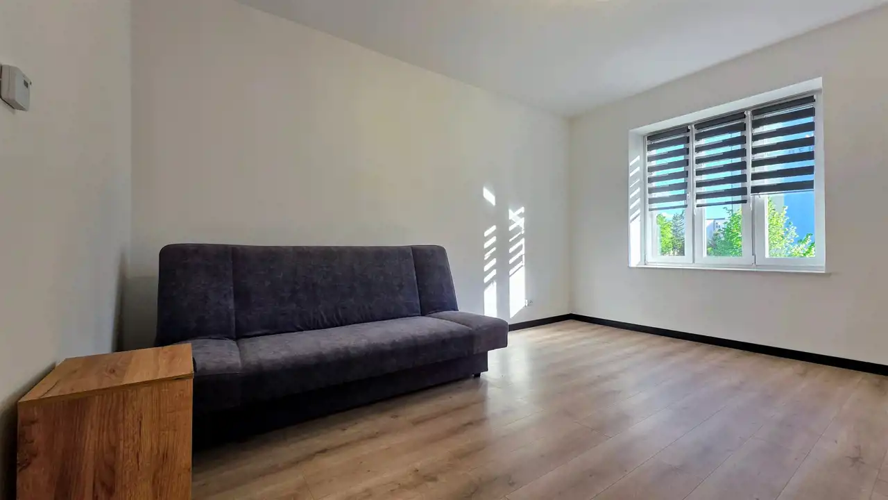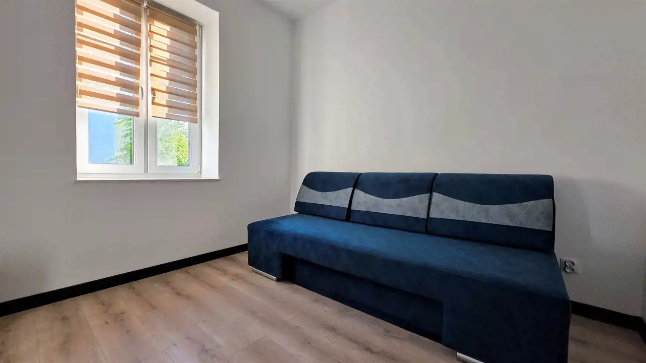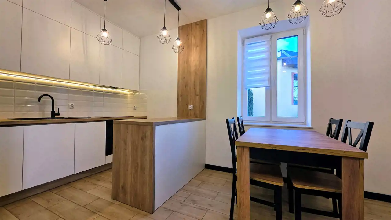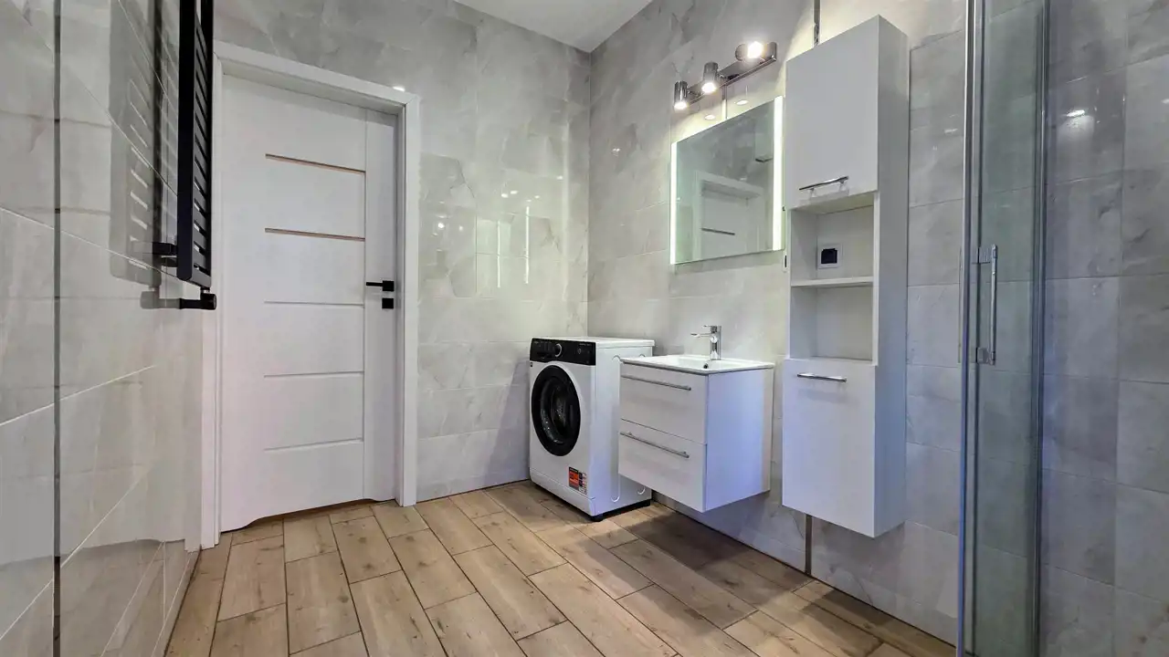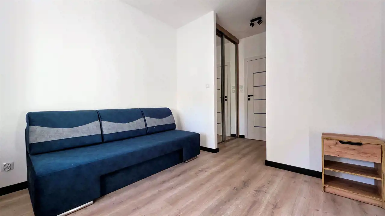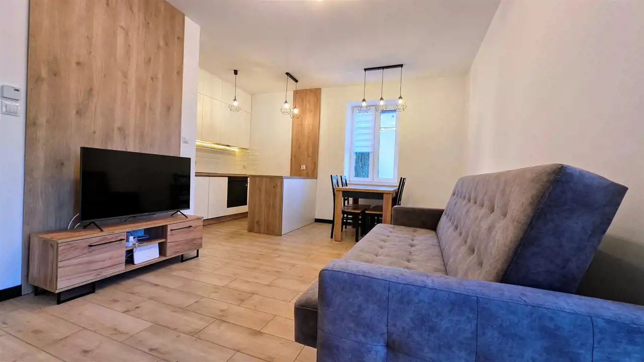 Przyszły najemca otrzyma komfortowe mieszkanie, wykończone z dbałością o każdy detal. Ściany pokryto białą farbą marki Tikkurila, zaś na podłogach ułożono panele marki Quick-Step oraz gres. W trosce o bezpieczeństwo lokatorów zamontowano zewnętrzne drzwi antywłamaniowe Porta oraz domofon. Łazienka wraz z WC urządzona została w nowoczesną, szklaną kabinę prysznicową z odpływem liniowym i zestawem prysznicowym z termostatem marki KFA, umywalkę wraz z szafkami, lustro oraz pralkę Whirlpool. W salonie z aneksem kuchennym zamontowane zostały meble kuchenne w zabudowie ze sprzętem AGD: lodówko -zamrażarka i zmywarka Samsung, piekarnik elektryczny i płyta indukcyjna Hotpoint - Ariston, oraz okap. Salon został wyposażony w komplet wypoczynkowy, komodę RTV, telewizor oraz stół z krzesłami. W sypialniach znajdują się dwie szafy typu Komandor, komoda oraz łóżka. Dodatkowo w mieszkaniu zamontowane jest nowoczesne oświetlenie wnętrz, które pozwala na uzyskanie efektu przyjemnej i klimatycznej przestrzeni.