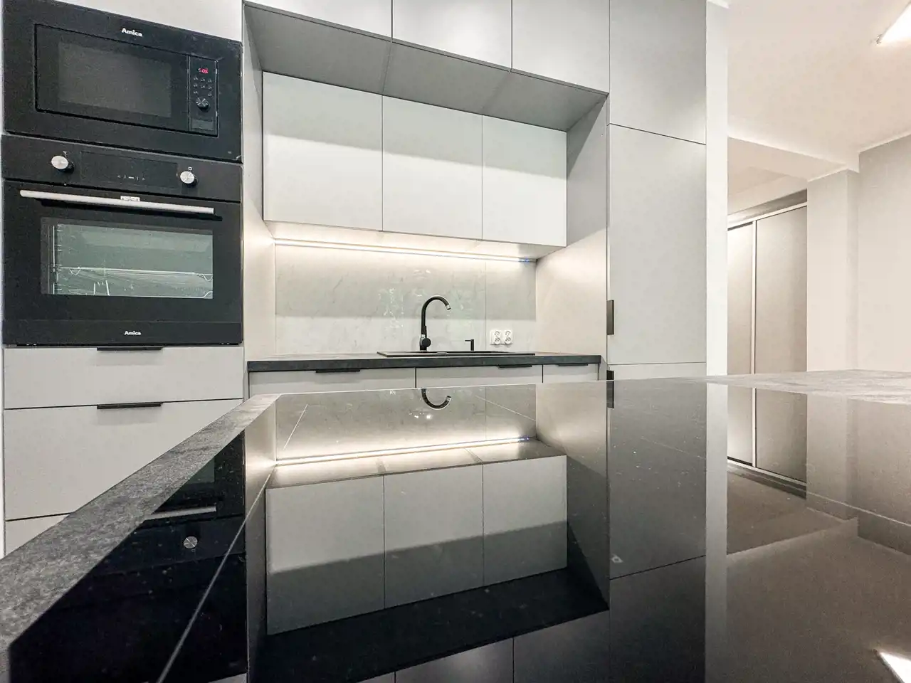 Kuchnie w kolorze antracytowym wykonano na wymiar z wysokiej jakości materiałów, wyposażono w sprzęt AGD (piekarnik, mikrofalówka, zmywarka). Połączenie salonu z jadalnią i aneksem kuchennym sprawia, że wnętrze jest funkcjonalne.