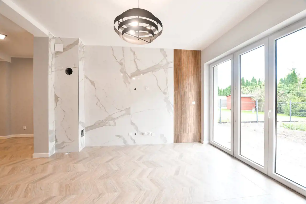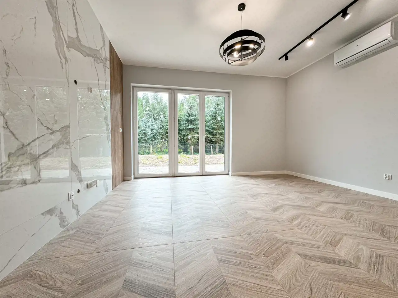Nieruchomość zaprojektowano z myślą o zapewnieniu komfortu jego mieszkańcom, urządzono z dbałością o każdy detal. Zastosowanie delikatnych barw, aranżacja biokominka na ścianie telewizyjnej sprawia, że wnętrze jest ciepłe i przytulne.