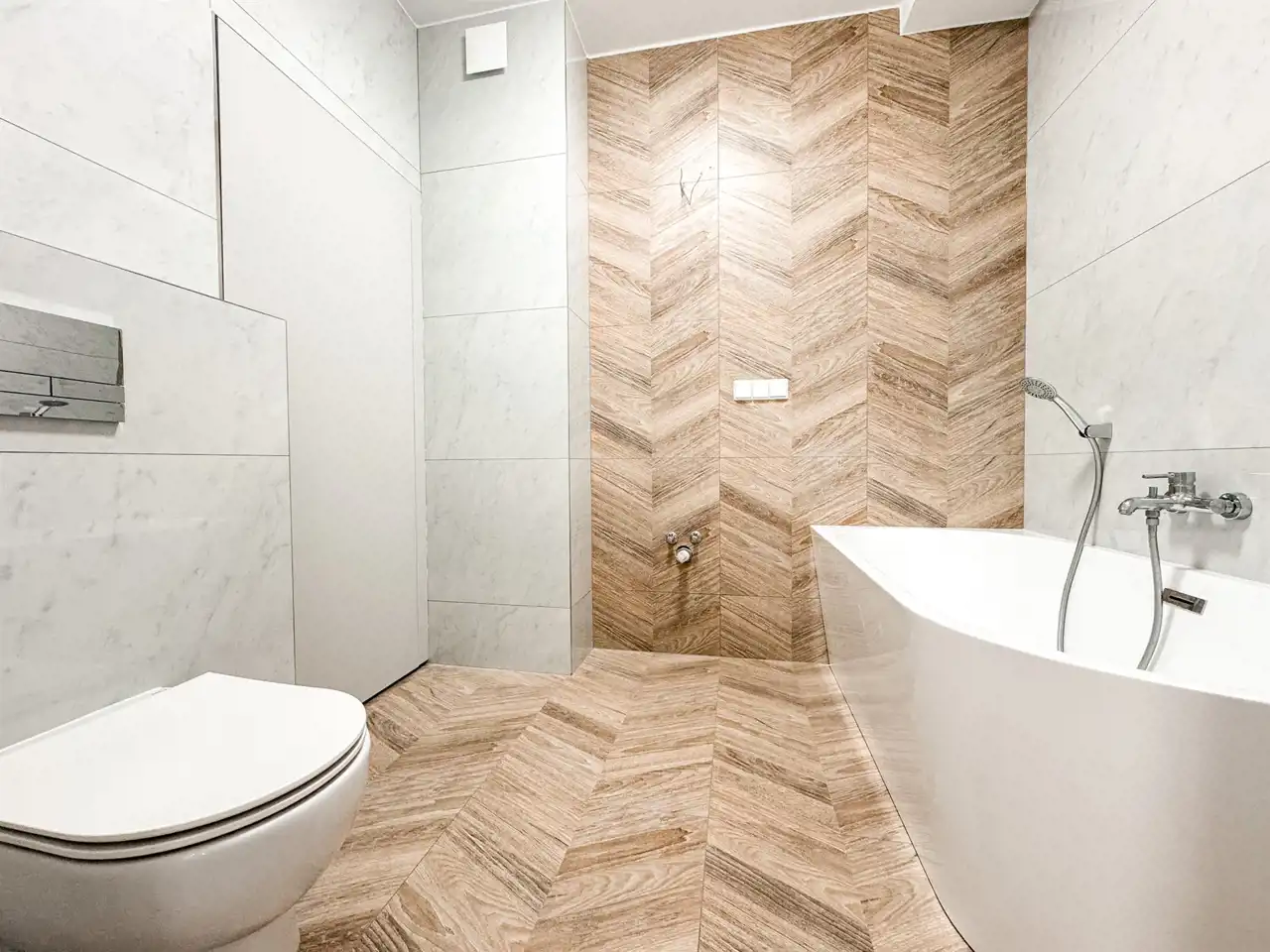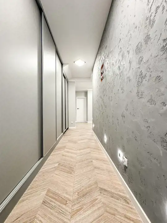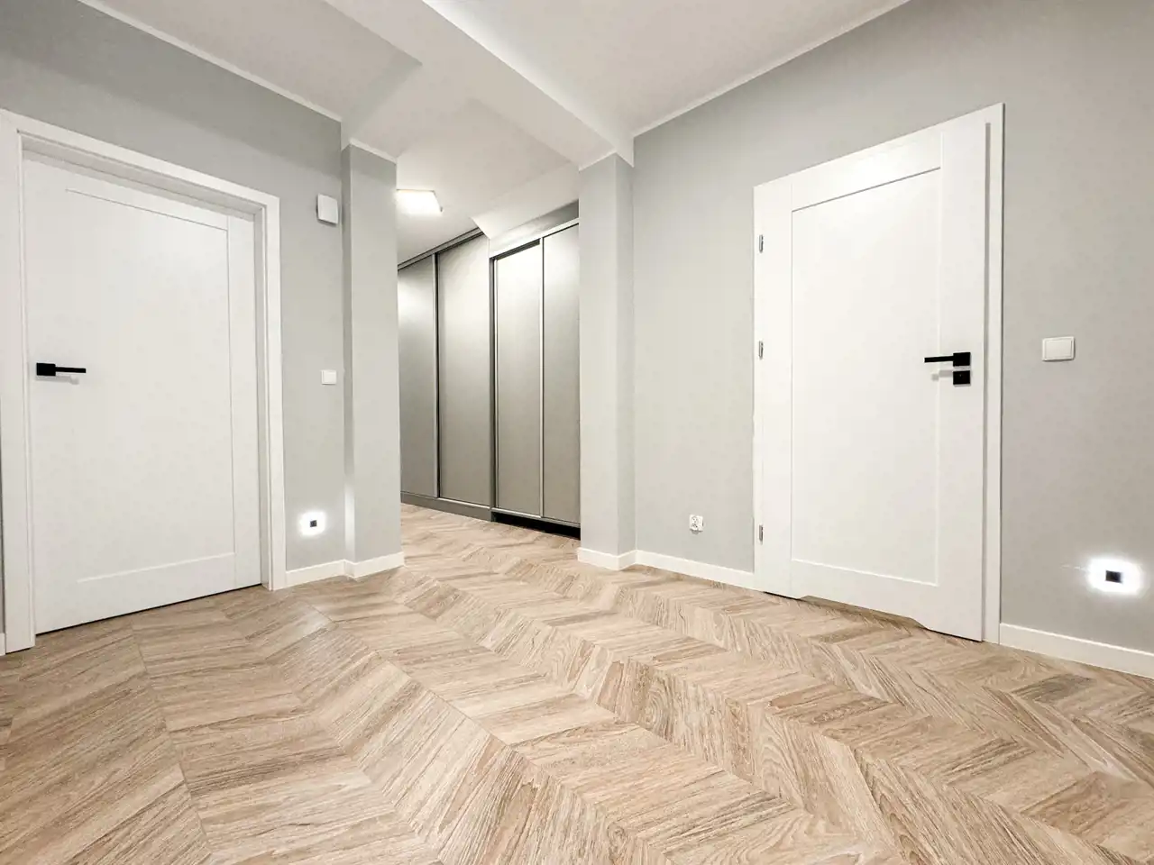 W przedpokoju na całej długości ściany zamontowano szafę pod zabudowę, dzięki czemu maksymalnie wykorzystano przestrzeń niezbędną do przechowywania. W łazience znajduje się wanna, kabina prysznicowa umywalka, wc oraz dodatkowo pralnia (pralka).