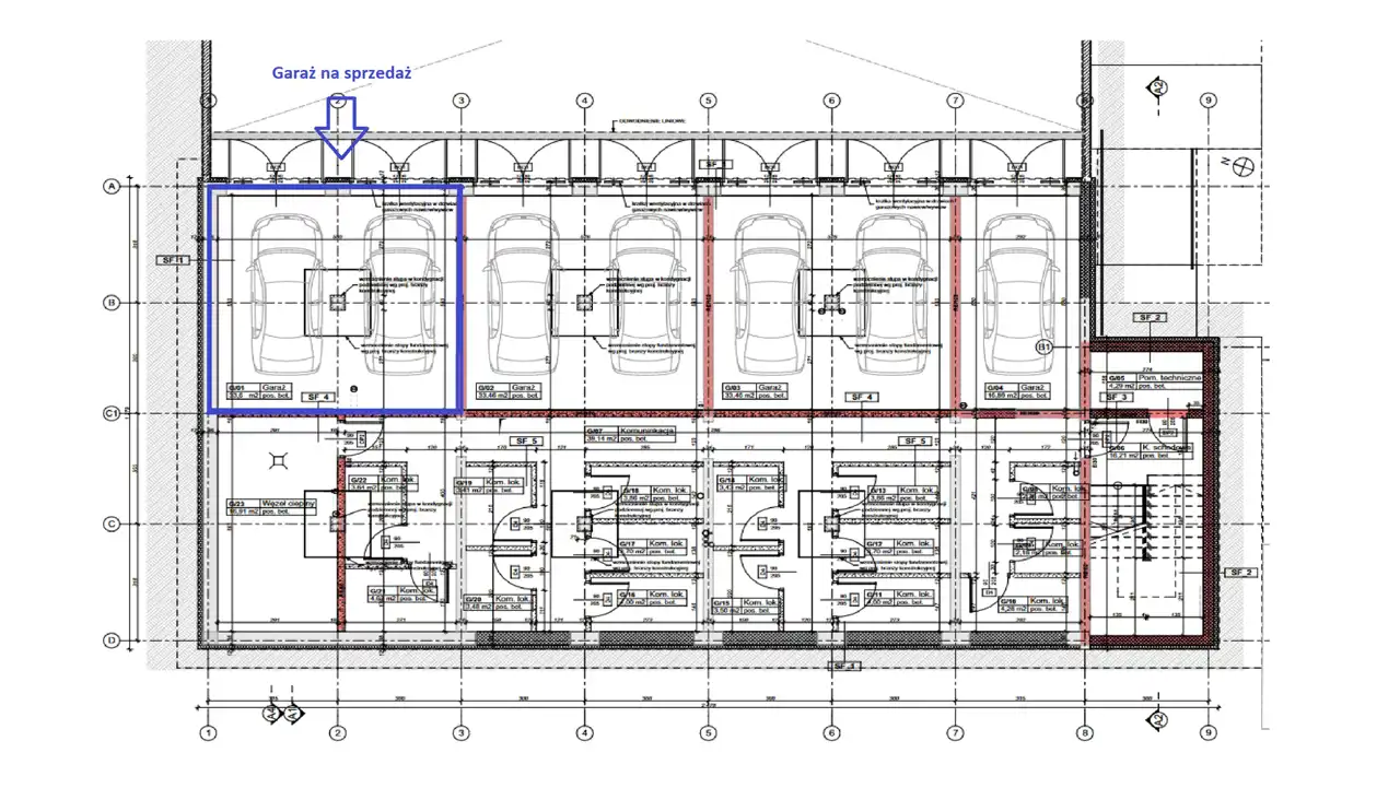 Garaż posiada ściany pomalowane na biało i zainstalowano w nim oświetlenie. W garażu zamontowane są 2 uchylne bramy wjazdowe. Wysoki standard nieruchomości potwierdza również fakt, że teren bloku jest dodatkowo ogrodzony wraz z elektrycznie sterowaną na pilota bramą. Wnętrze oferowanej do najmu nieruchomości jest ciepłe, dzięki ogrzewanym mieszkaniom, znajdującym się bezpośrednio nad garażem. Plan nieruchomości ukazany jest w załączonym slajdzie.