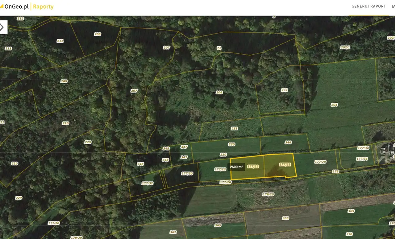Przedmiotem sprzedaży jest nieruchomość składająca się z dwóch działek ewidencyjnych 177/22 i 177/21 o łącznej powierzchni 26 arów. Większość terenu znajduje się na obszarze oznaczonym w Miejscowym Planie symbolem MN (tereny zabudowy mieszkaniowej), niewielka część działki 177/21 na obszarze ZN (tereny zieleni nieurządzonej).