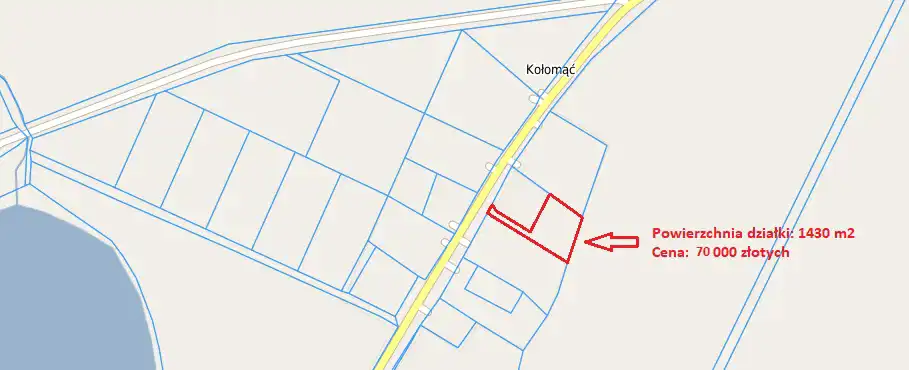 Polecamy Państwu na sprzedaż działkę budowlaną o powierzchni 1430 m2 w cenie 70 000 złotych. Działka położona jest w pobliżu jeziora, przy głównej drodze asfaltowej, w centrum miejscowości Kołomąć, oddalonej około 8 kilometrów od Gryfic, 14 kilometrów od Golczewa oraz 32 kilometry od miejscowości nadmorskiej Pobierowo. Działka posiada wydane warunki zabudowy - na budowę budynku mieszkalnego jednorodzinnego parterowego z możliwym poddaszem użytkowym, wraz z garażem (wolnostojącym lub wbudowanym w bryłę budynku mieszkalnego), wraz z niezbędną infrastrukturą techniczną. Prąd znajduje się się przy działce. W warunkach zabudowy przewidziana jest budowa studni przydomowej, ale istnieję też możliwość doprowadzenia wody z sieci.
