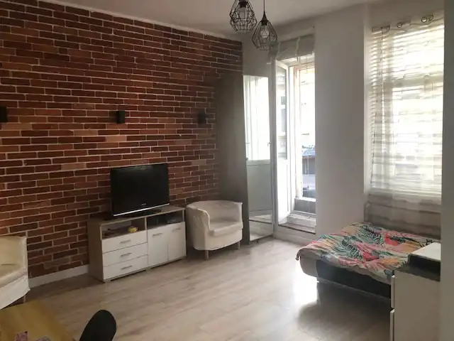 Drugie mieszkanie składa się z pokoju połączonego z aneksem kuchennym i łazienki połączonej z WC, wyposażonej w wannę.