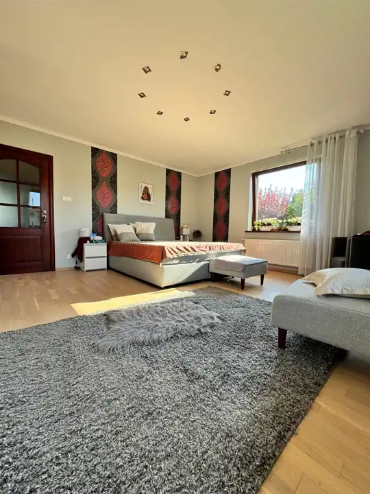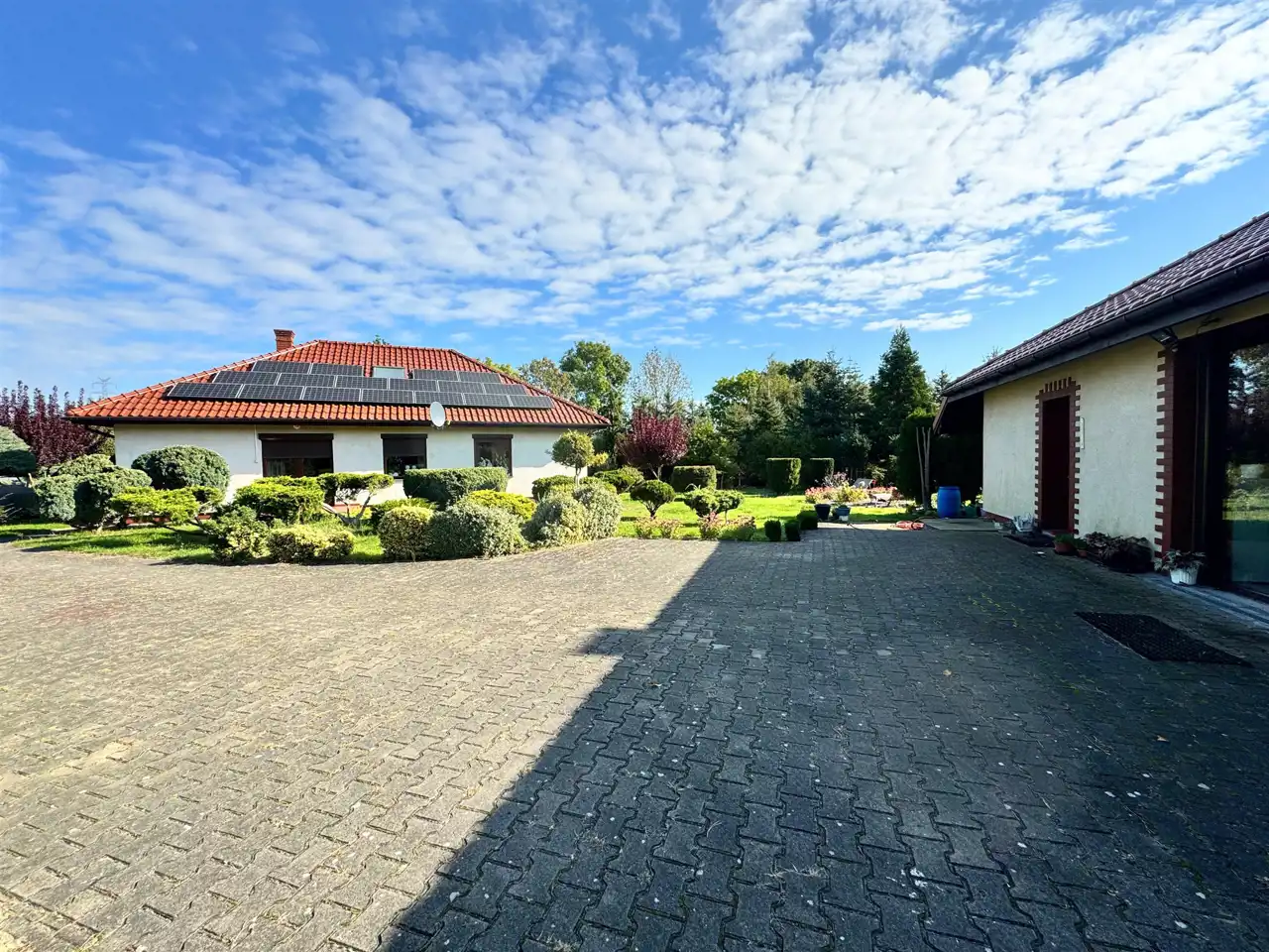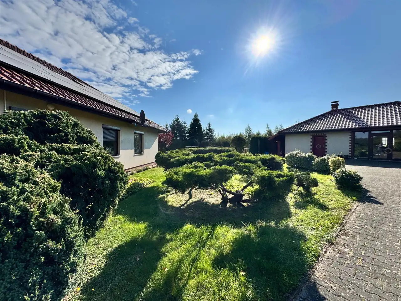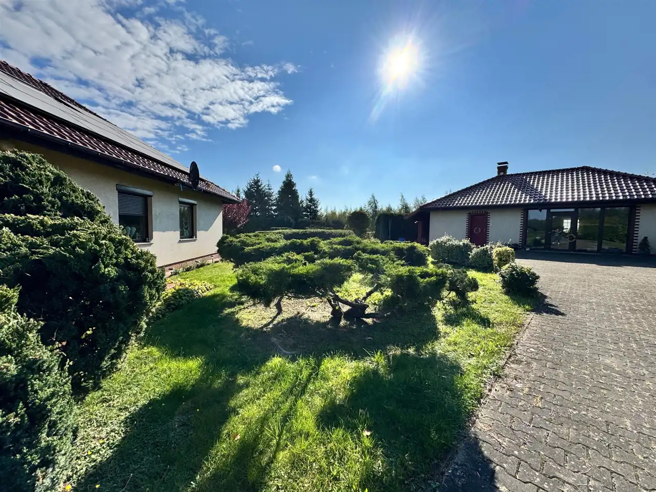 Budynek dodatkowy na działce (garażowo-gospodarczy) budowany jako garaż, obecnie zaadoptowany na mieszkalny (można przywrócić pierwotną funkcję zdejmując okna bo brama elektryczna jest zamontowana). Znajdziemy tu także przestrzeń na antresoli jako cześć sypialna. Dodatkowo jest łazienka i kuchnia oraz piwnica w której jest umieszczony cały system ogrzewania i filtry.