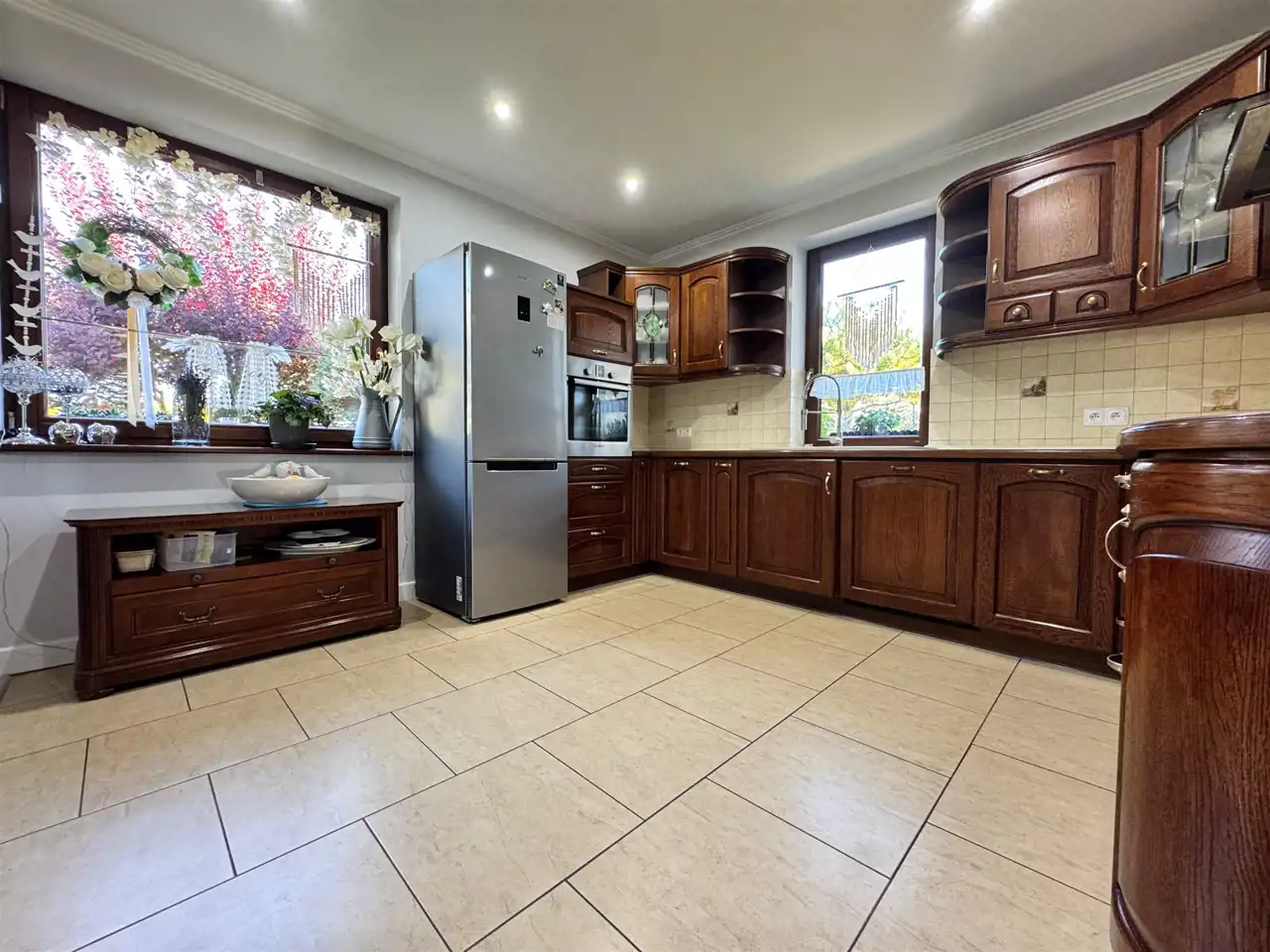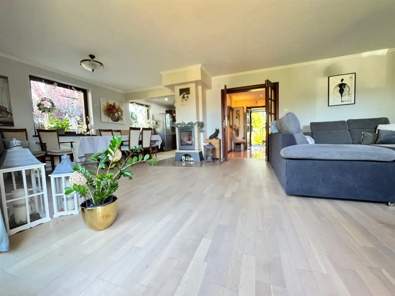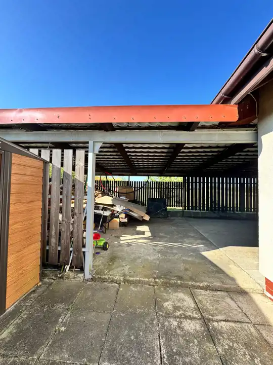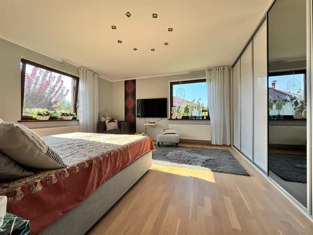 Budynek dodatkowy na działce (garażowo-gospodarczy) budowany jako garaż, obecnie zaadoptowany na mieszkalny (można przywrócić pierwotną funkcję zdejmując okna bo brama elektryczna jest zamontowana). Znajdziemy tu także przestrzeń na antresoli jako cześć sypialna. Dodatkowo jest łazienka i kuchnia oraz piwnica w której jest umieszczony cały system ogrzewania i filtry.