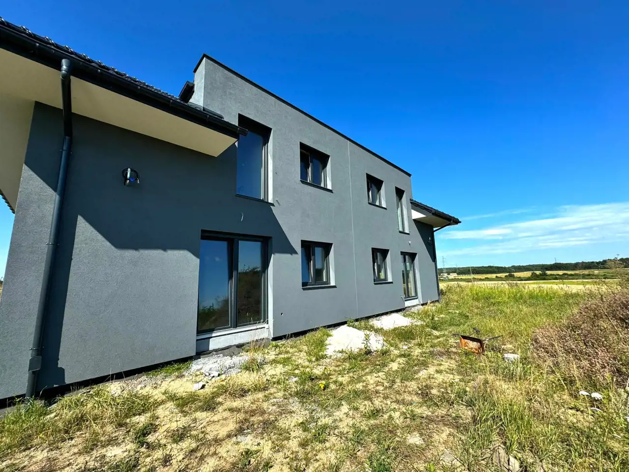 Ocieplenie - styropian grafitowy 20 cm, dachówka ceramiczna Roben, pompa ciepła, dach ocieplony pianą PUR, poddasze podłoga w OSB, sufity na górze wykończone w płytach gk, założone kontakty i włączniki w kolorze białym, rolety zewnętrzne, w pełni wykończona kotłownia w gresie, wykonane gładzie, położony polbruk, zrobione tarasy i podjazdy.