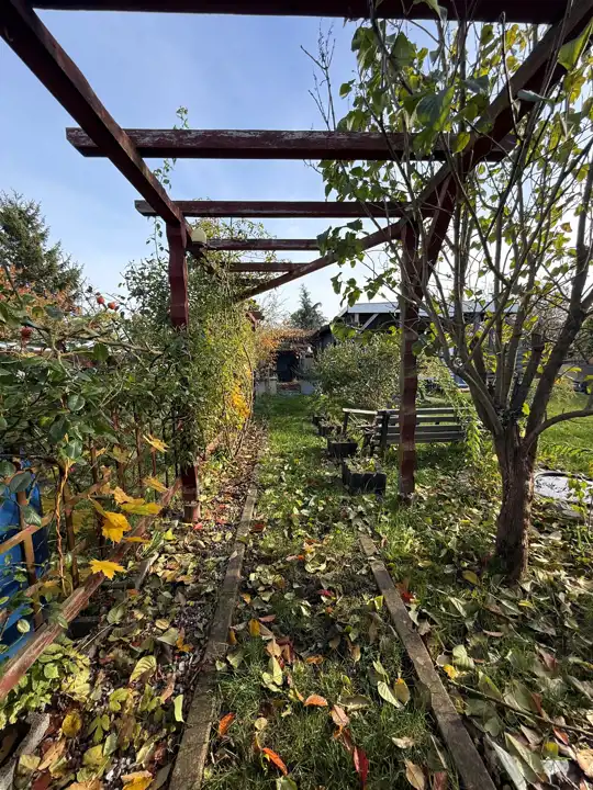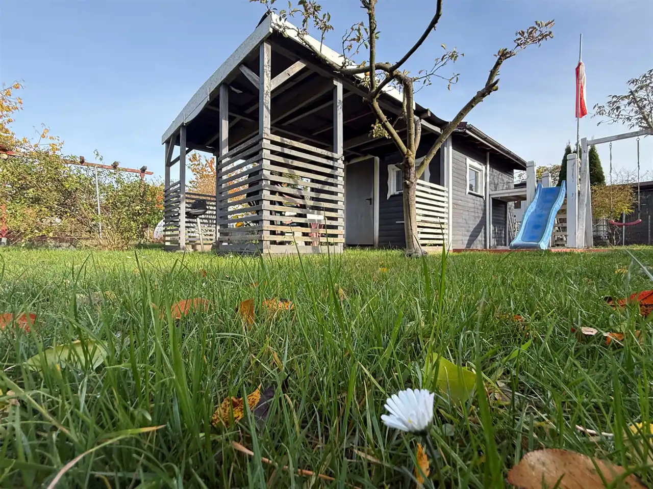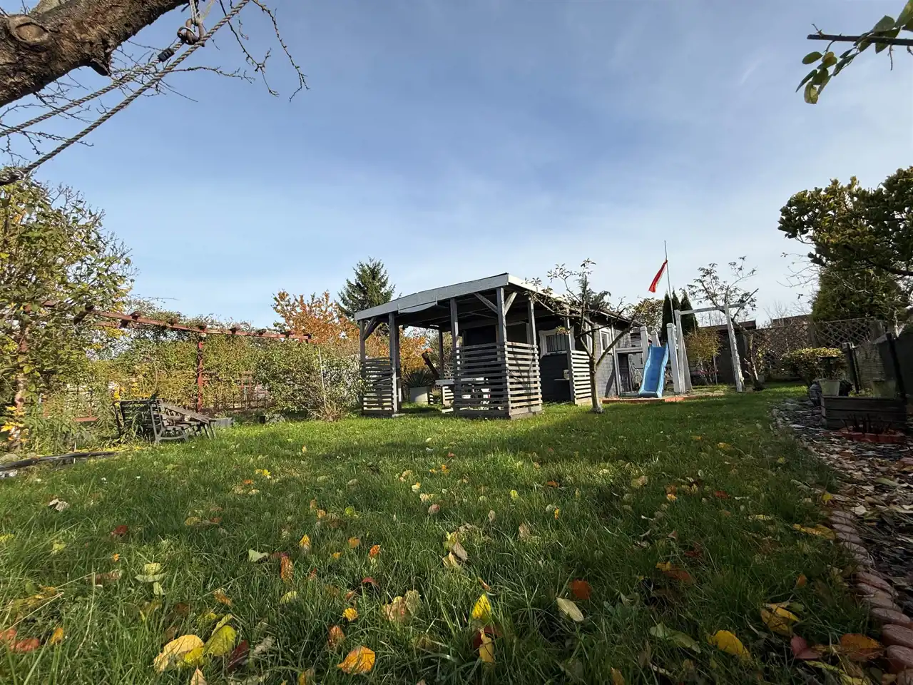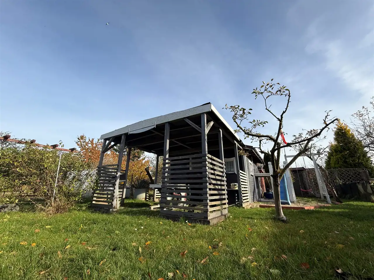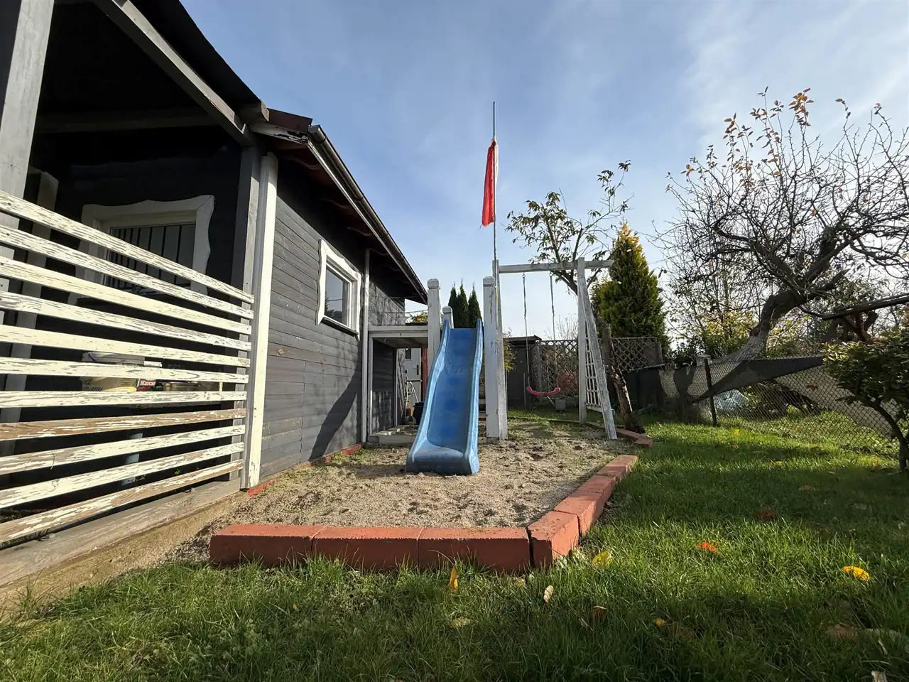 - druga część działki pełni funkcję rekreacyjną – znajduje się tu drewniana altanka wykonana z należytą starannością, plac zabaw dla dzieci, toaleta, a także drzewa owocowe, krzewy i zadbany trawnik, które tworzą przyjemną przestrzeń do relaksu.