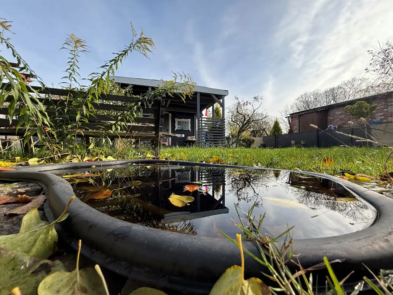 - drzewa owocowe, krzewy oraz zadbany trawnik, które tworzą przyjemną, zieloną przestrzeń.