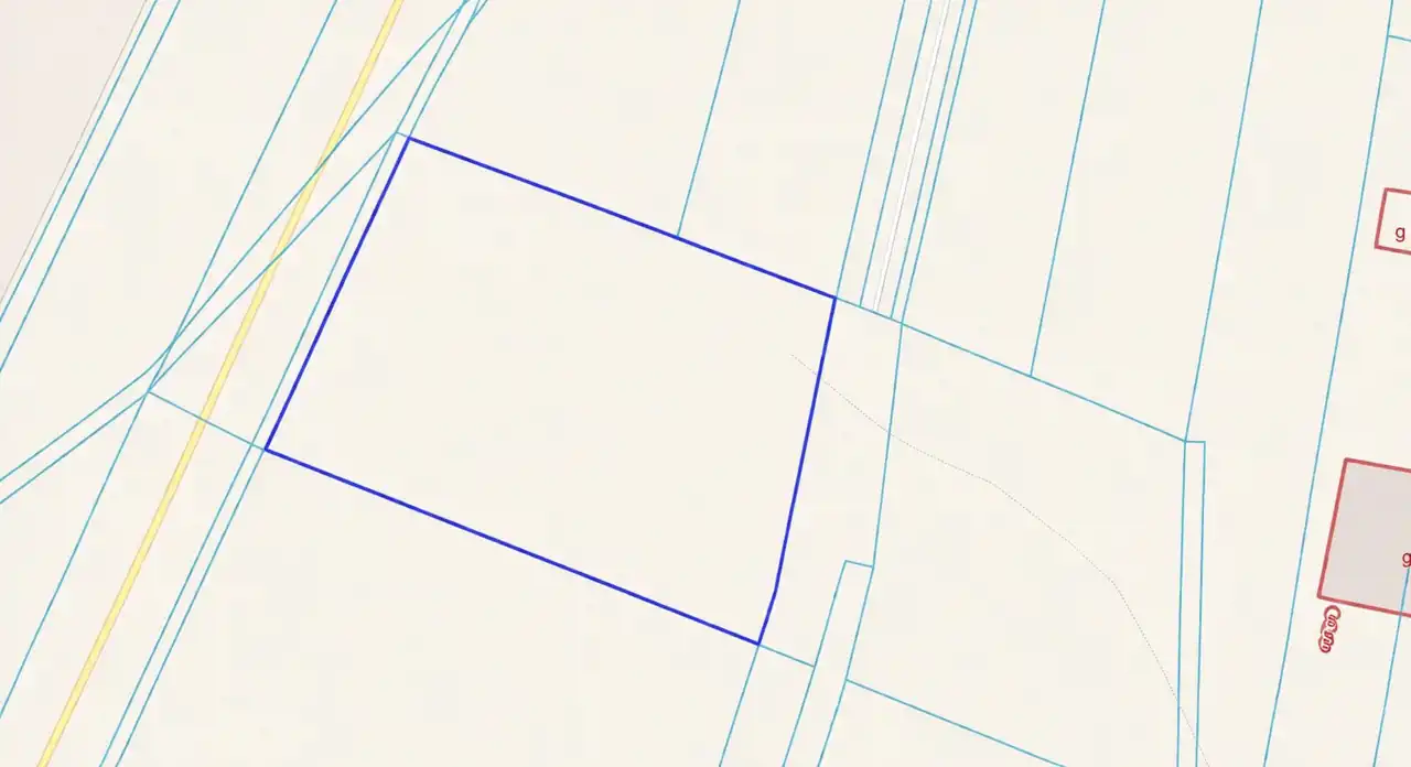 Działka o powierzchni 5198 m2 bezpośrednio przylega do dwóch dróg (wewnętrznej i krajowej). W równym kształcie prostokąta, płaska.