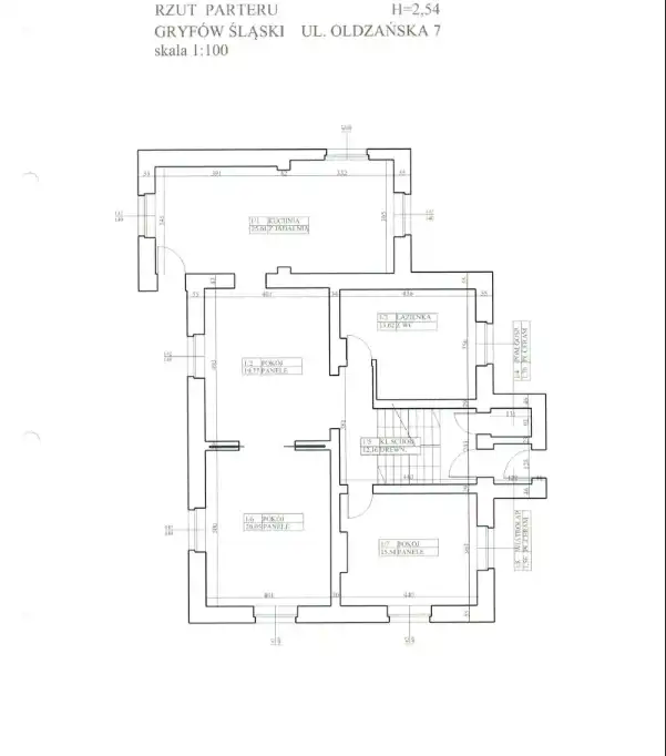 ( kuchnia z jadalnią, 3 pokoje, łazienka z WC, klatka schodowa, wiatrołap)