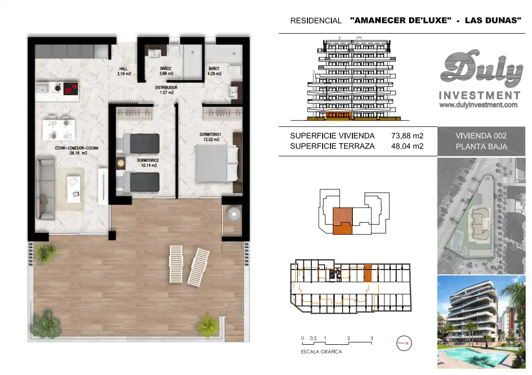 Kompleks mieszkaniowy Amanecer De'luxe Las Dunas składa się z budynku w nowoczesnym stylu, w którym znajdzie się 31 domów z 2 sypialniami, 2 łazienkami i dużymi tarasami o powierzchni 20 m², podziemnym parkingiem i zamykaną komórką lokatorską. Budynek będzie składał się z 9 kondygnacji, z których najwyższe to penthousy z głównym tarasem i prywatnym solarium.
