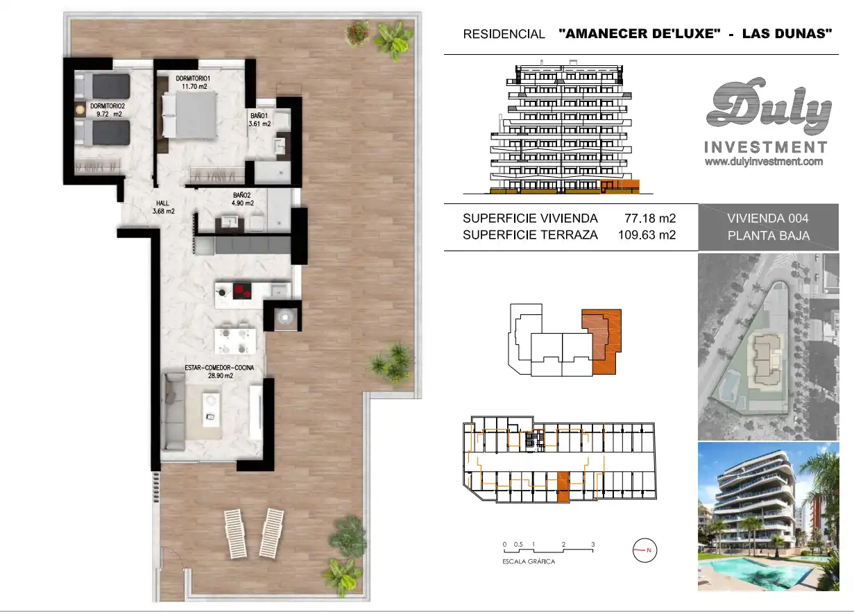 Kompleks mieszkaniowy Amanecer De'luxe Las Dunas składa się z budynku w nowoczesnym stylu, w którym znajdzie się 31 domów z 2 sypialniami, 2 łazienkami i dużymi tarasami o powierzchni 20 m², podziemnym parkingiem i zamykaną komórką lokatorską. Budynek będzie składał się z 9 kondygnacji, z których najwyższe to penthousy z głównym tarasem i prywatnym solarium.