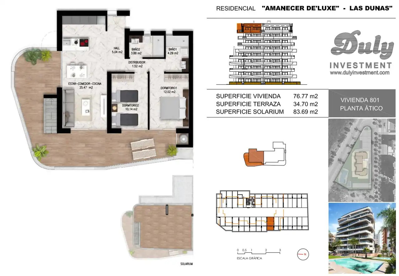 Kompleks mieszkaniowy Amanecer De'luxe Las Dunas składa się z budynku w nowoczesnym stylu, w którym znajdzie się 31 domów z 2 sypialniami, 2 łazienkami i dużymi tarasami o powierzchni 20 m², podziemnym parkingiem i zamykaną komórką lokatorską. Budynek będzie składał się z 9 kondygnacji, z których najwyższe to penthousy z głównym tarasem i prywatnym solarium.