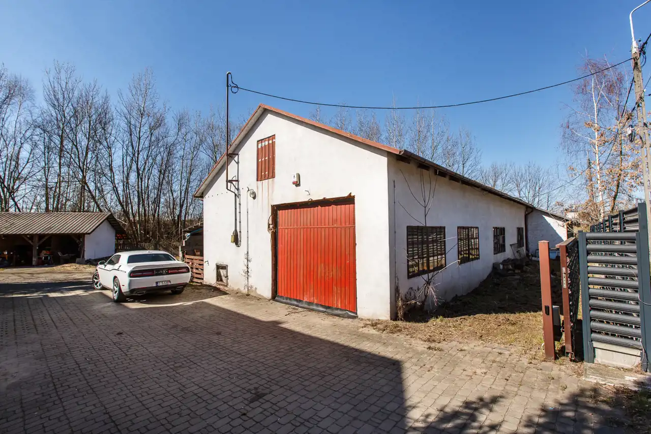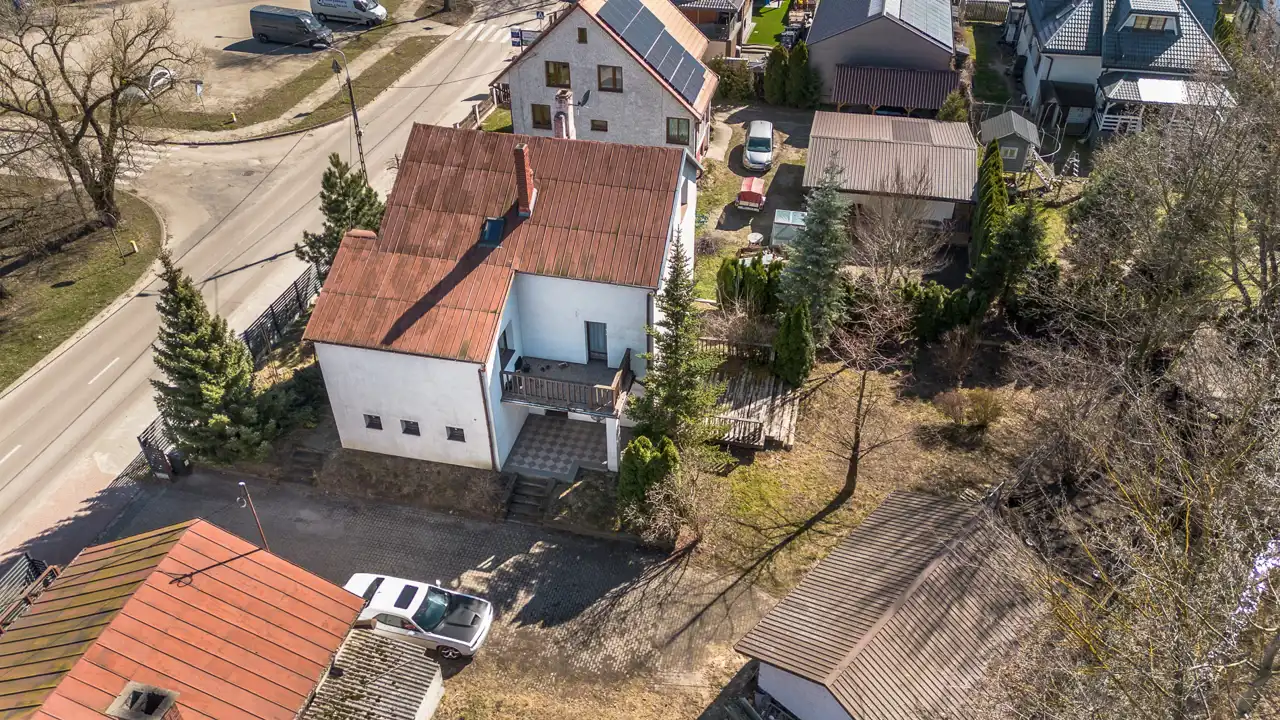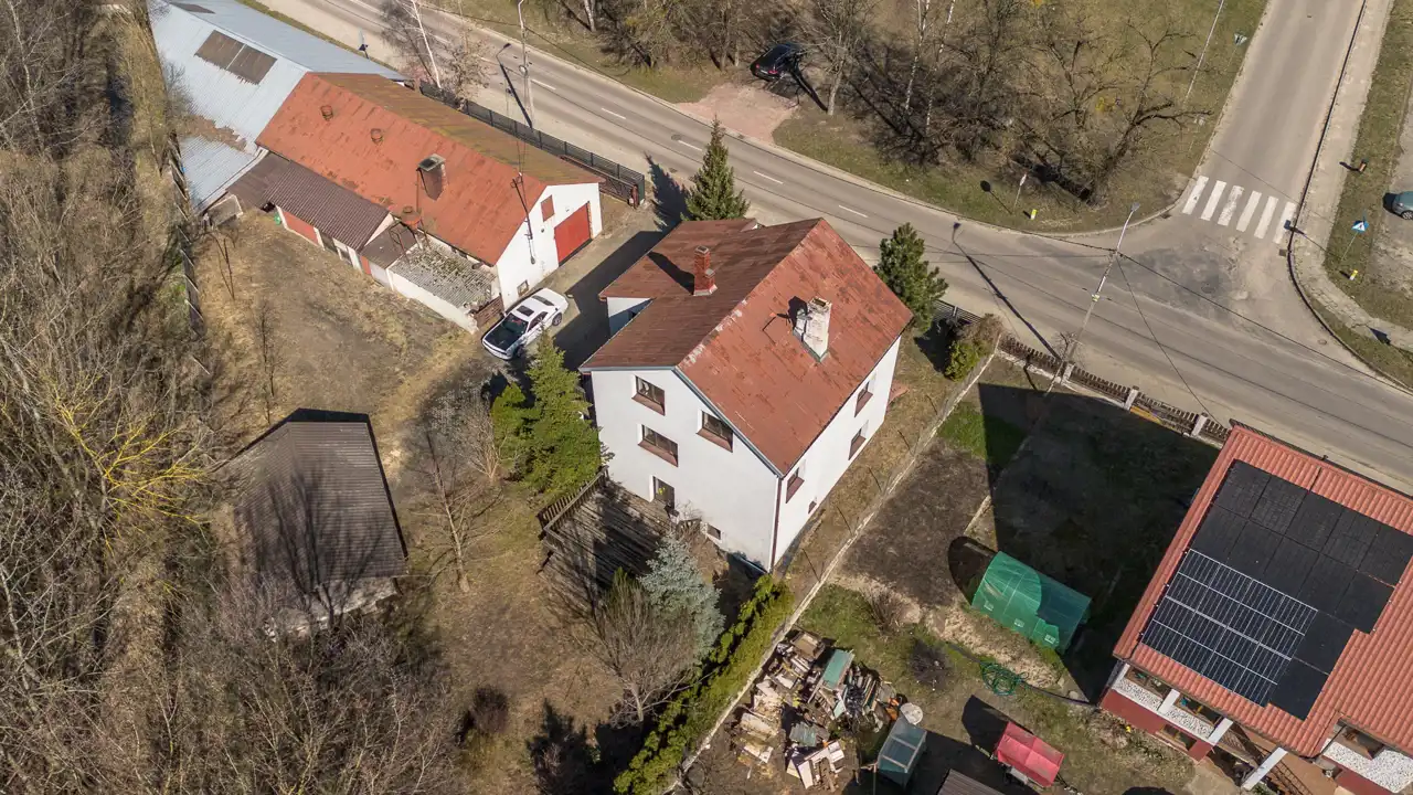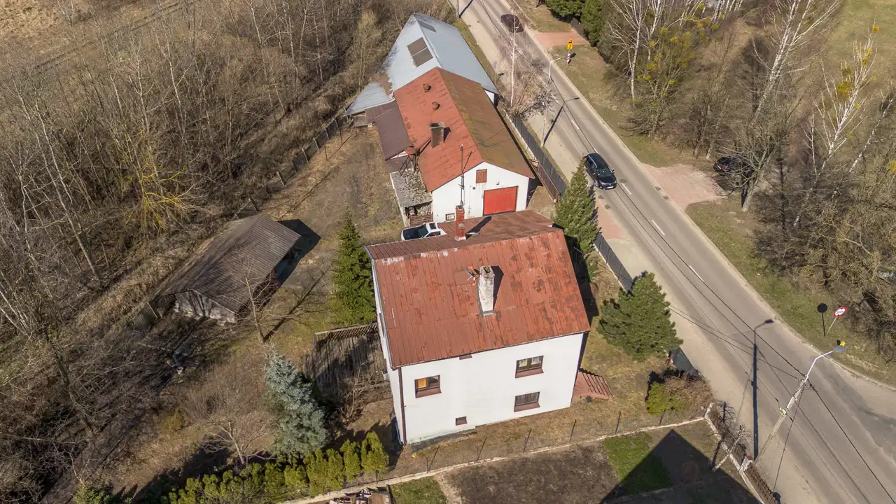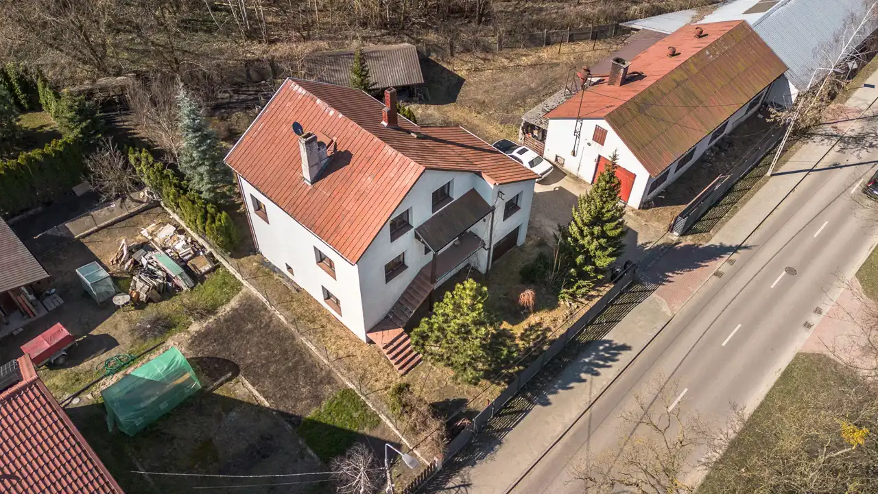 Na działce o powierzchni 1468 m2 znajduje się dom o pow. użytk. ok.300m2, budynek gospodarczy (obecnie stolarnia) ok.300m2 oraz wiata. Dojazd drogą asfaltową, dostępne wszystkie media miejskie (gaz w ulicy). Na działce liczne nasadzenia i krzewy.