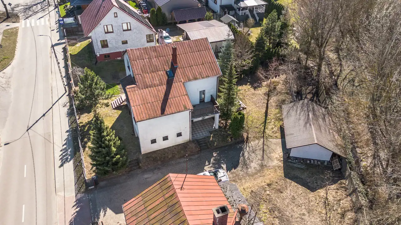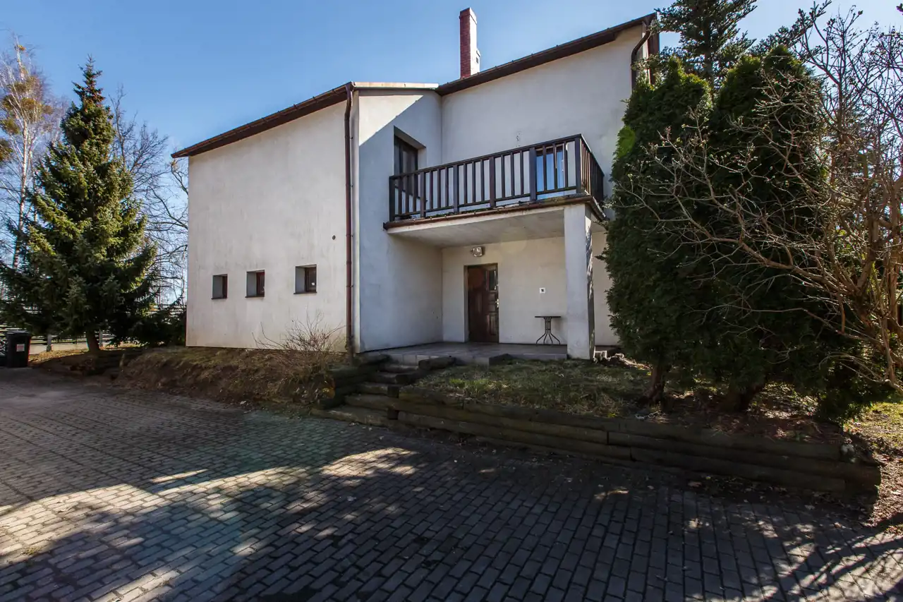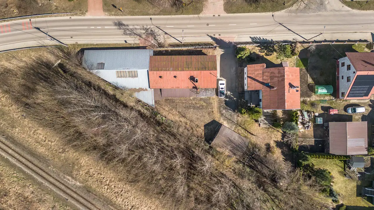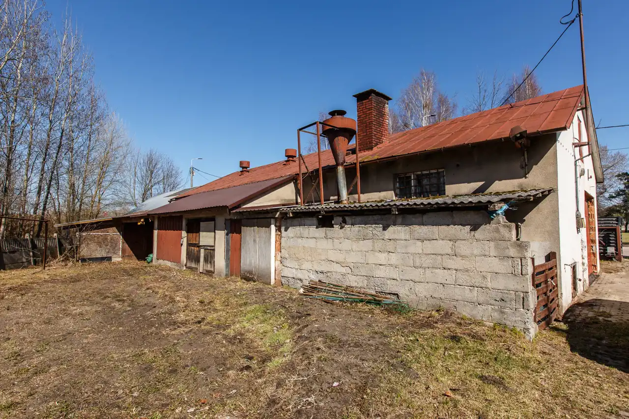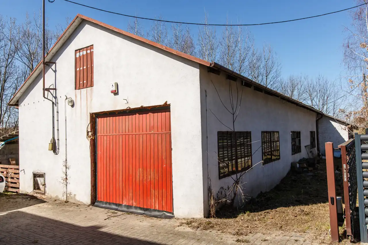Na działce o powierzchni 1468 m2 znajduje się dom o pow. użytk. ok.300m2, budynek gospodarczy (obecnie stolarnia) ok.300m2 oraz wiata. Dojazd drogą asfaltową, dostępne wszystkie media miejskie (gaz w ulicy). Na działce liczne nasadzenia i krzewy.
