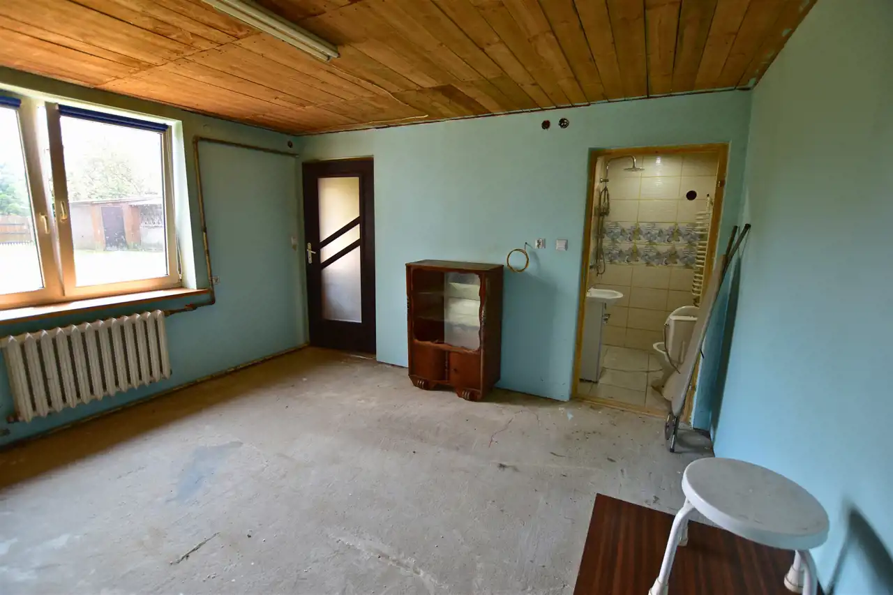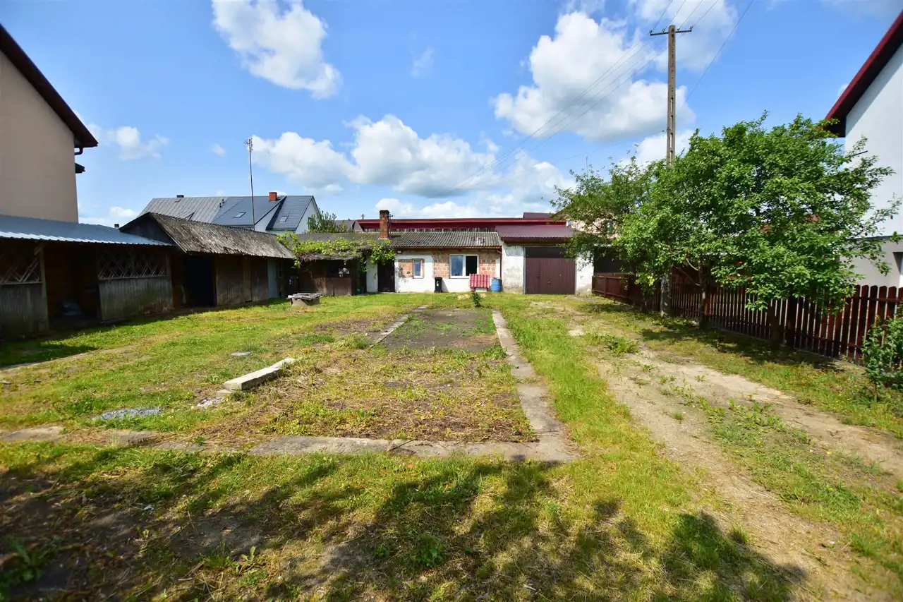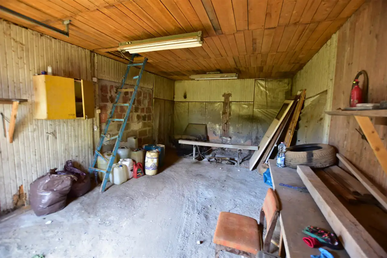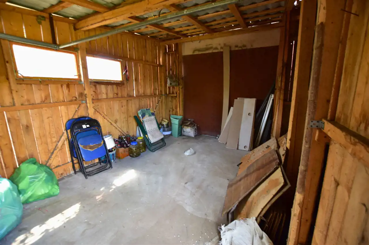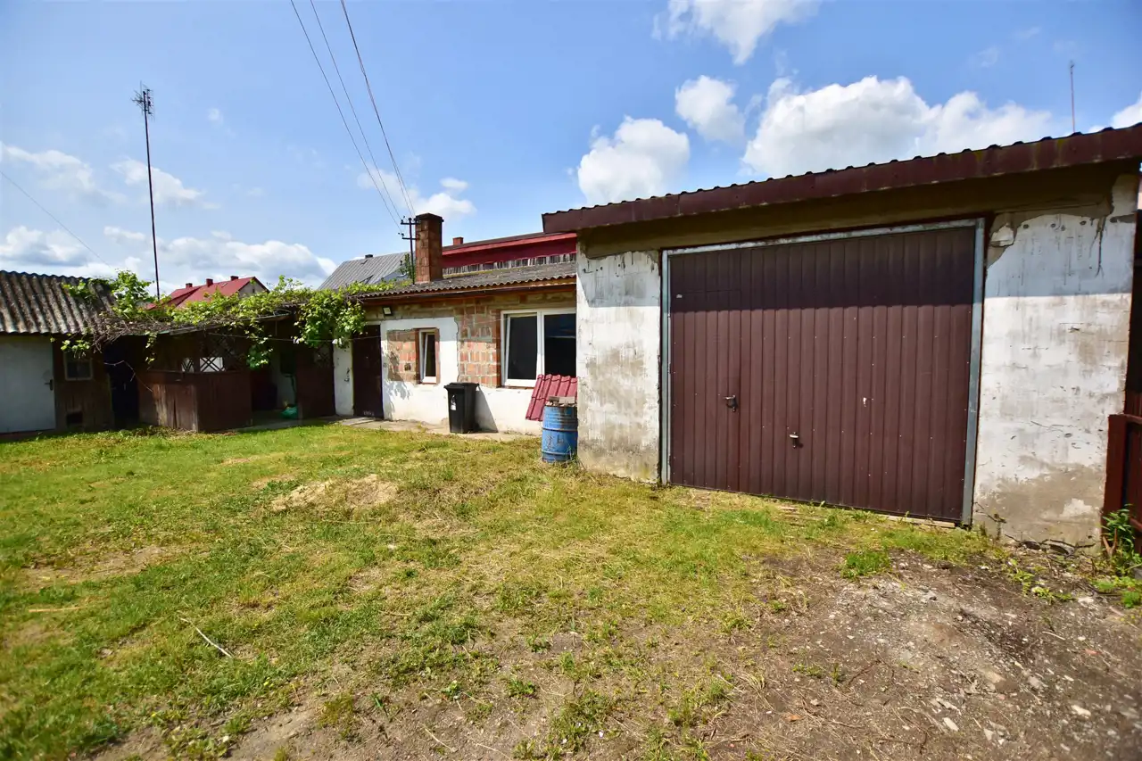 Na działce znajduje się budynek gospodarczy o powierzchni około 65 m². W jego skład wchodzą dwa pokoje, kuchnia z kotłownią oraz dwie łazienki, z czego jedna została wyremontowana. Ogrzewanie centralne, większość okien wymienionych na PCV zapewniają komfort użytkowania. Dodatkowo, na terenie posesji znajdują się dwa garaże, wiata i studnia, co zwiększa funkcjonalność tej nieruchomości.