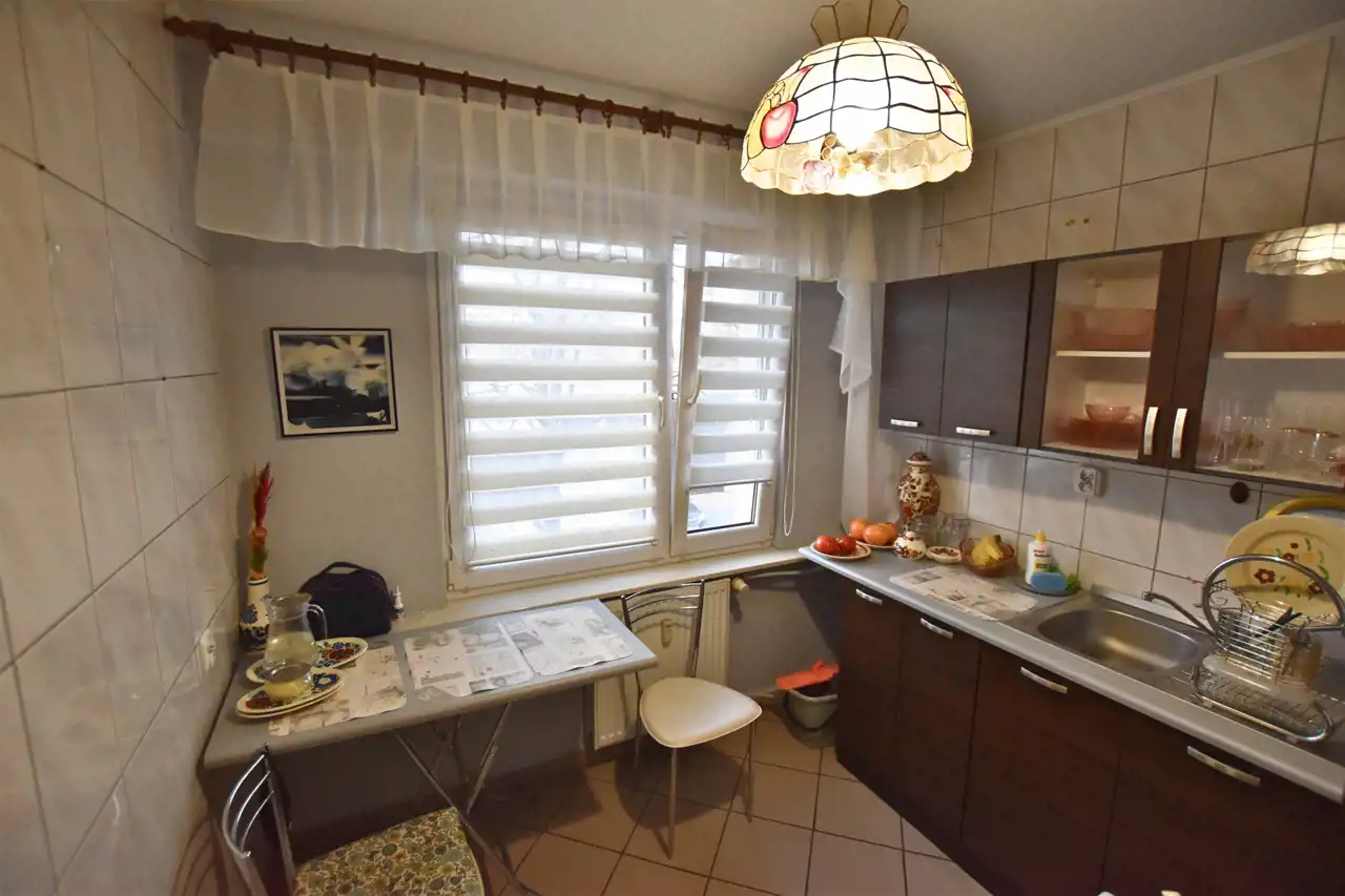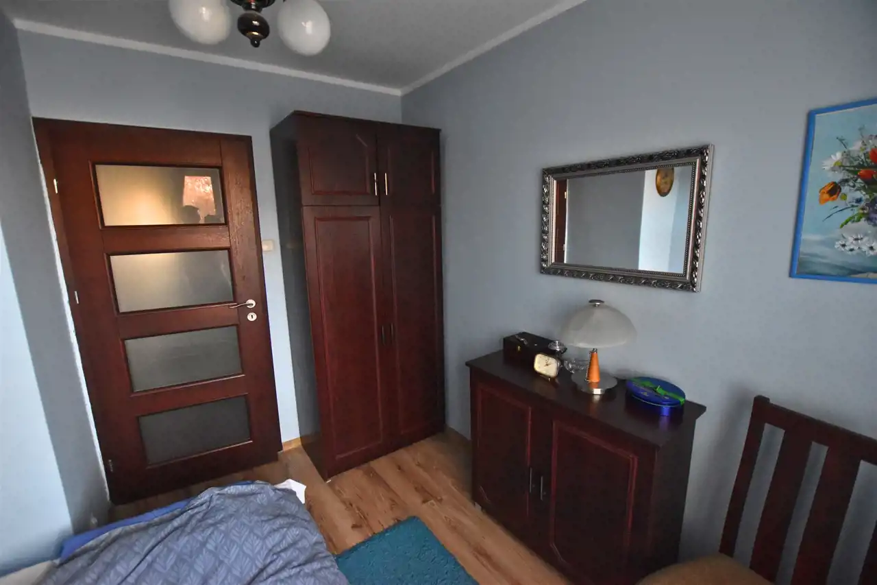 Wnętrze mieszkania utrzymane jest w bardzo dobrym stanie. Salon wyposażony w praktyczną szafę w zabudowie oferuje wygodne rozwiązania do przechowywania. Kuchnia jest widna, z praktyczną wnęką na lodówkę. Zastosowano nowe okna PCV, które zapewniają doskonałą izolację termiczną i akustyczną. Wszystkie instalacje elektryczne zostały wymienione, co podnosi bezpieczeństwo i komfort użytkowania.