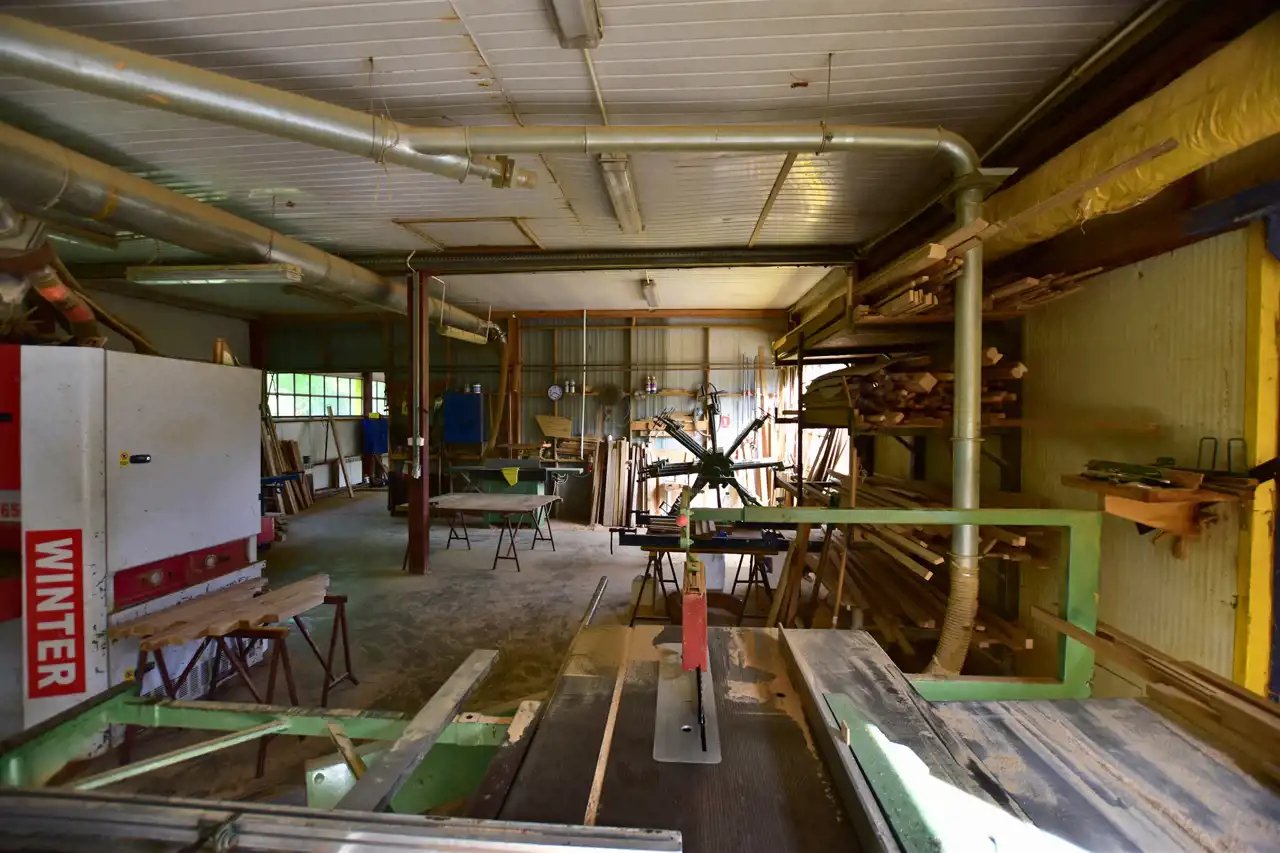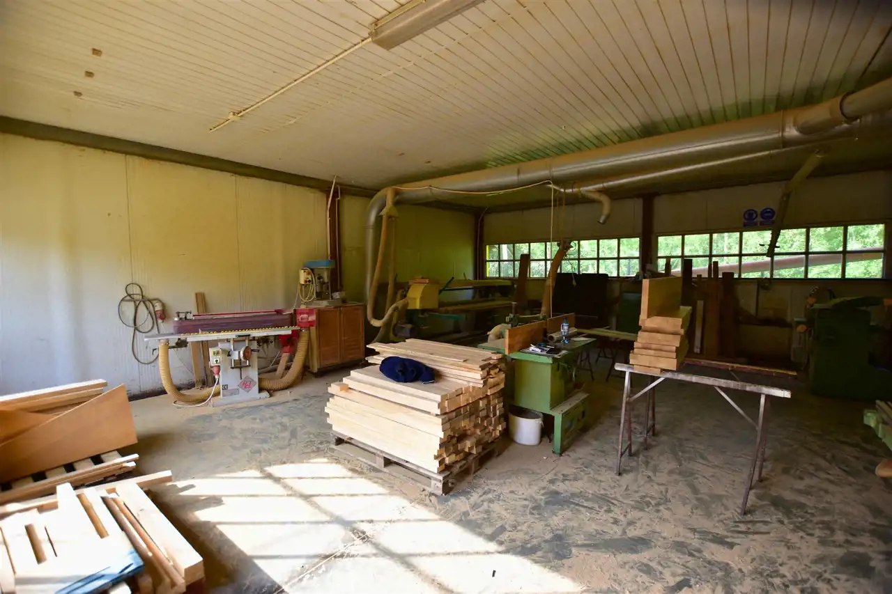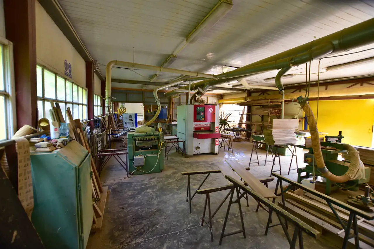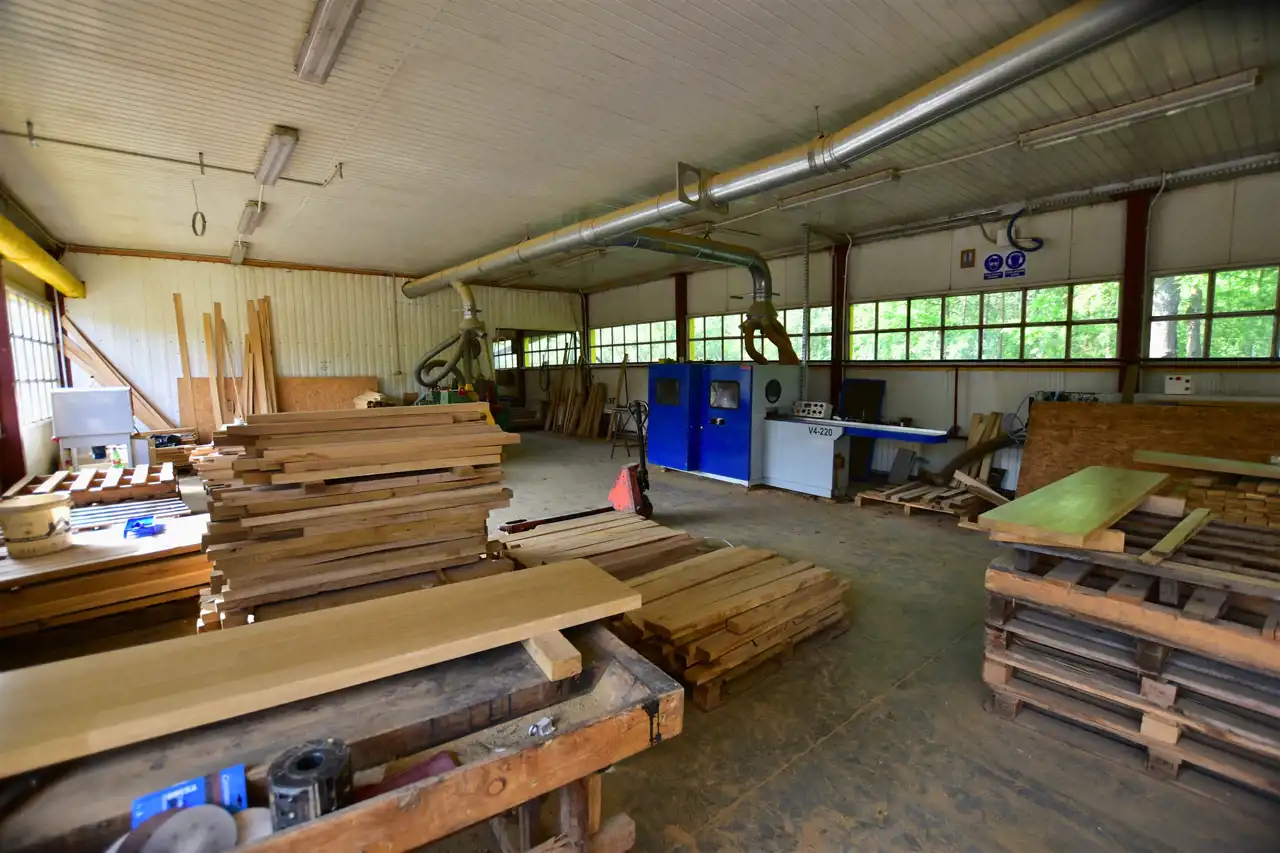 W skład oferty wchodzi hala produkcyjna z ocieplanymi prefabrykatami oraz nowoczesnym ogrzewaniem piecem na trociny. Dodatkowo, obiekt wyposażony jest w funkcjonalną suszarnię drewna o powierzchni 24 m², wiatę o powierzchni 80 m², a także trzy garaże typu blaszak, co zwiększa jego wszechstronność.
