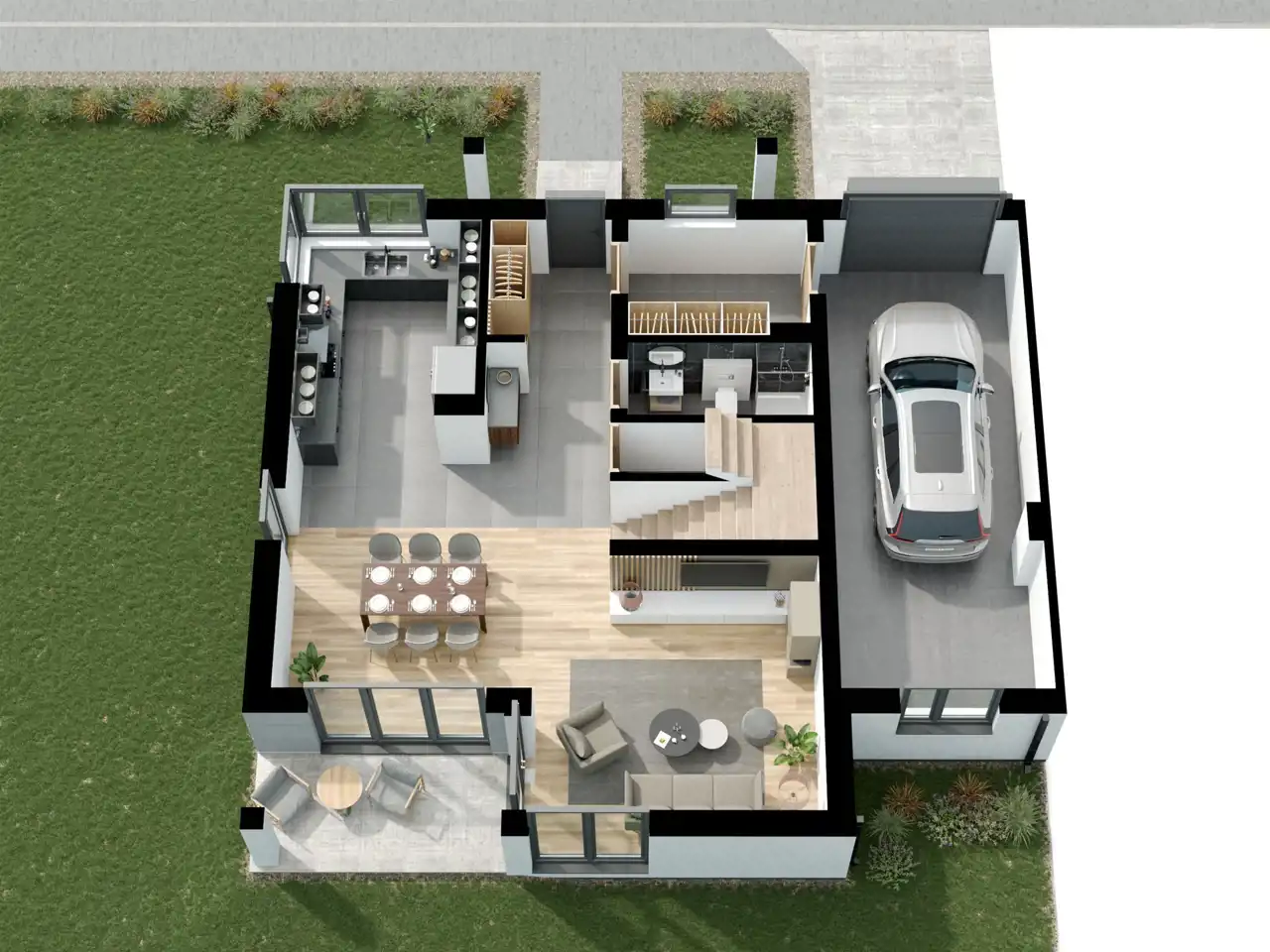- parter: garaż (duży, samochód, motory, rowery), salon z jadalnią, aneksem kuchenny, przedpokój, łazienka i pomieszczenie techniczne