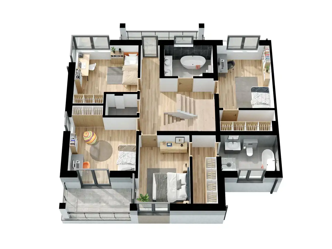 - piętro: 4 sypialnie ( w tym jedna typu Master z łazienką i garderobą), łazienka, garderoba, balkon.