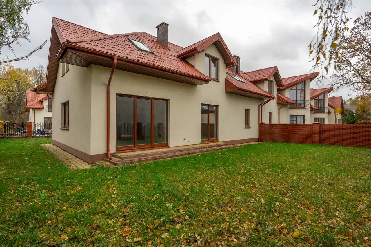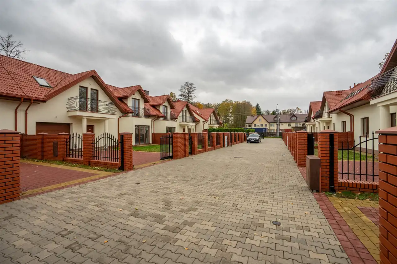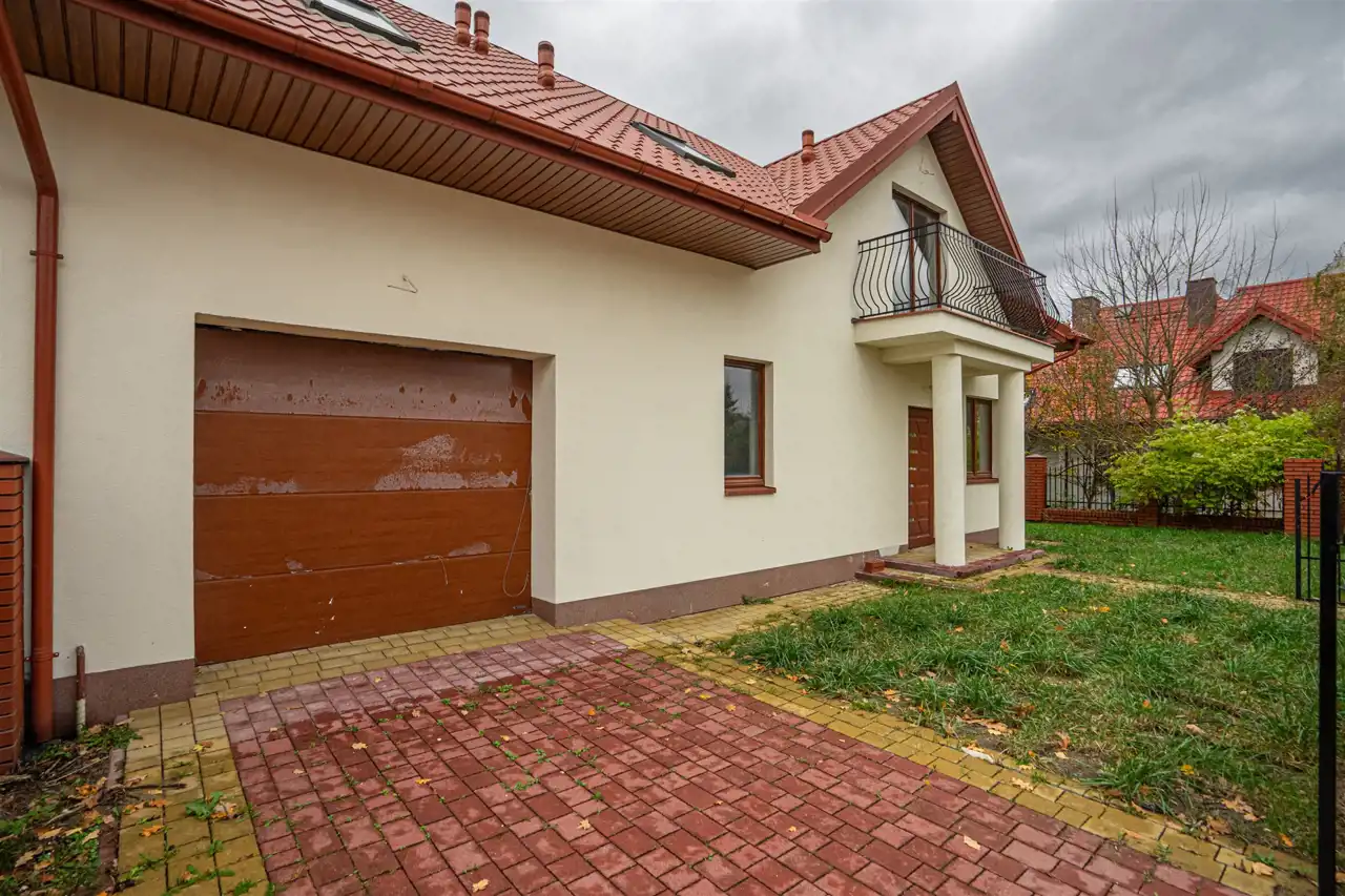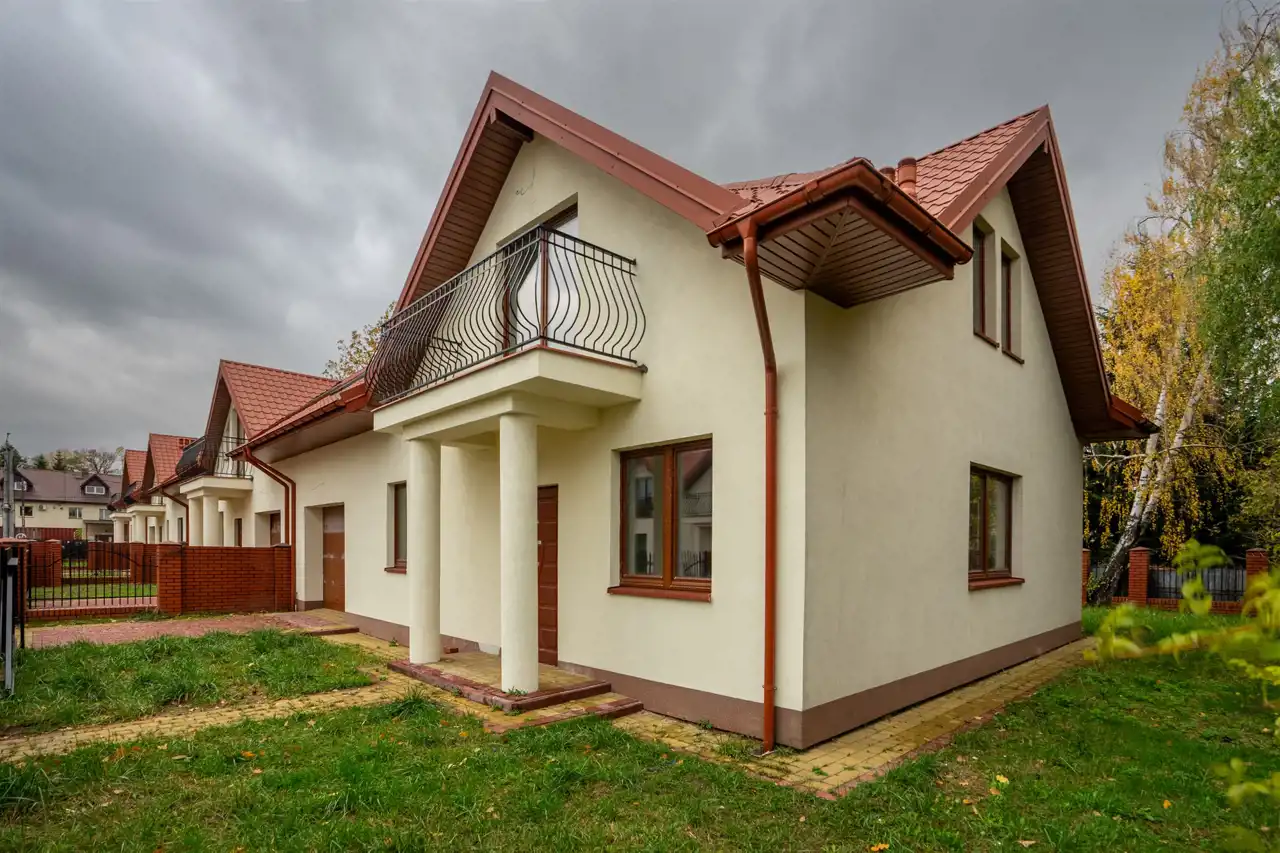 Dom wykończony w standardzie deweloperskim z garażem w bryle budynku. Elewacja w jasnych kremowych kolorach, klinkierowe kominy, pokrycie dachówką w kolorze brązowym, podobnie jak wszystkie obróbki blacharskie/orynnowanie. Kute, metalowe balustrady balkonów. Tarasy z kostki brukowej w kolorze brązowym. Wszystkie media miejskie(woda, prąd, kanalizacja,gaz). Ogrzewanie - piec gazowy.