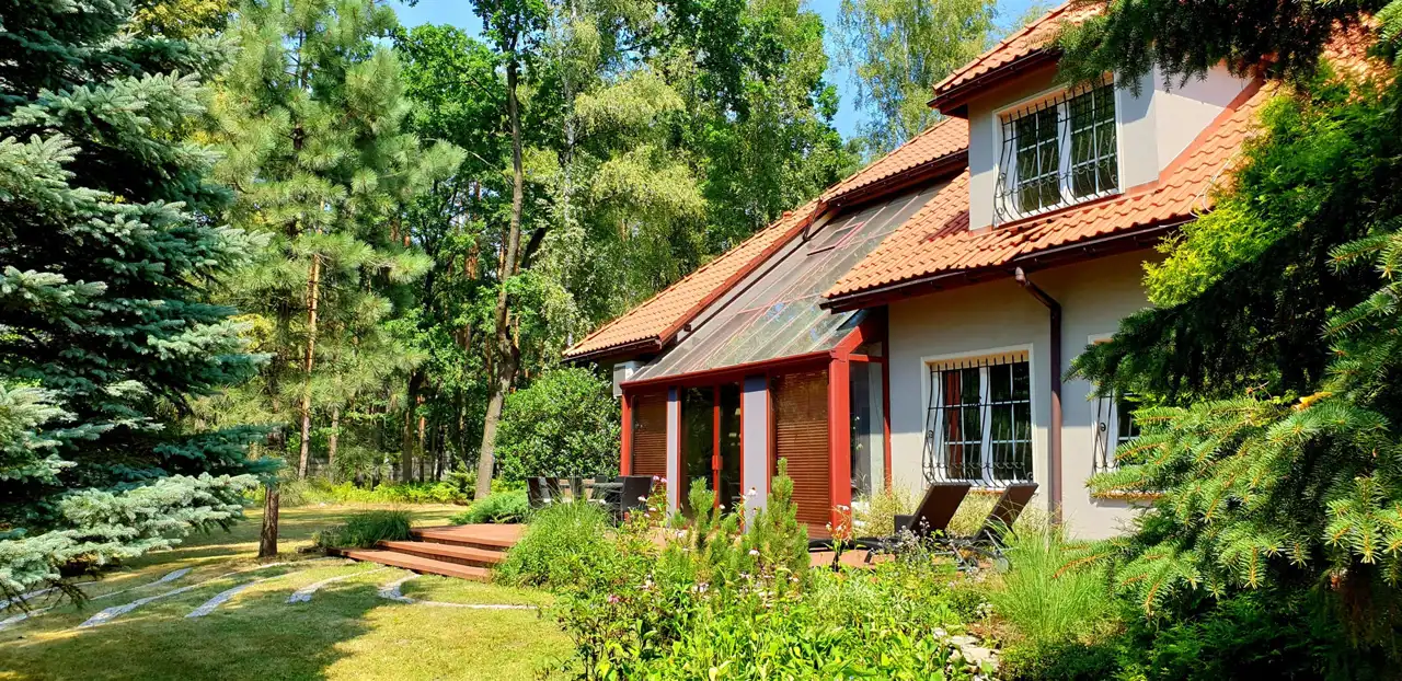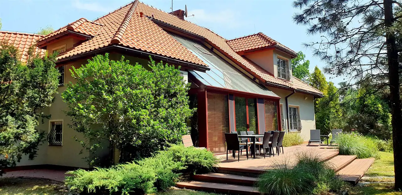 Powierzchnia całkowita ok. 400m2, powierzchnia użytkowa 329,6m2, 7 pokoi, duży ogród 4.500m2.