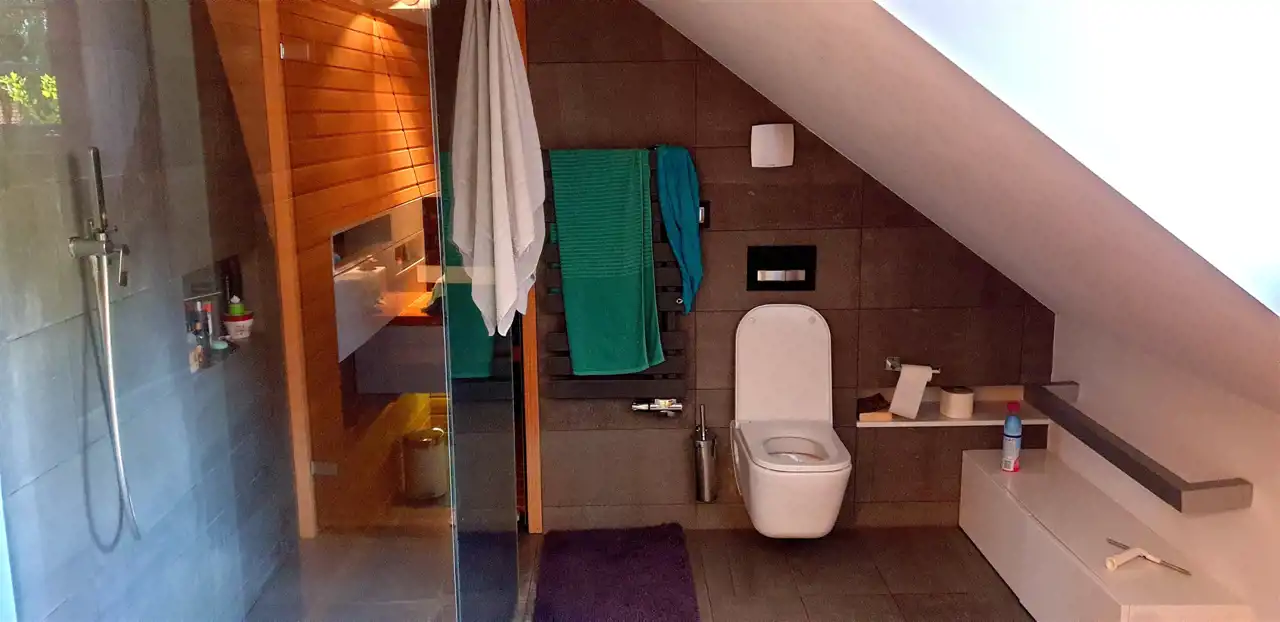PODDASZE: gabinet 6,7m2; komunikacja 23,8m2; sypialnie (26,4m2; 18,2m2; 20,2m2); garderoby (3,5m2; 2,3m2; 4,9m2); łazienk 2,7m2; łazienka z sauną 8,9m2; pomieszczenie gospodarcze 3,1m2.