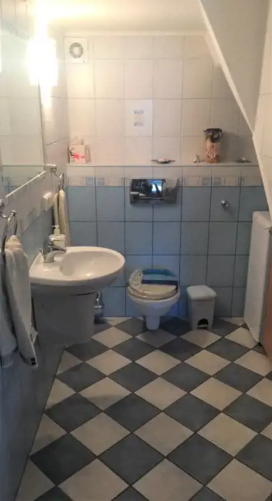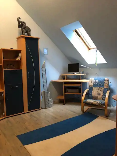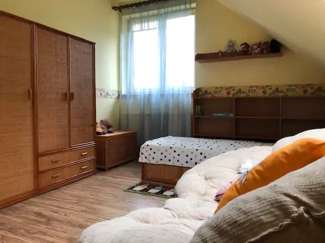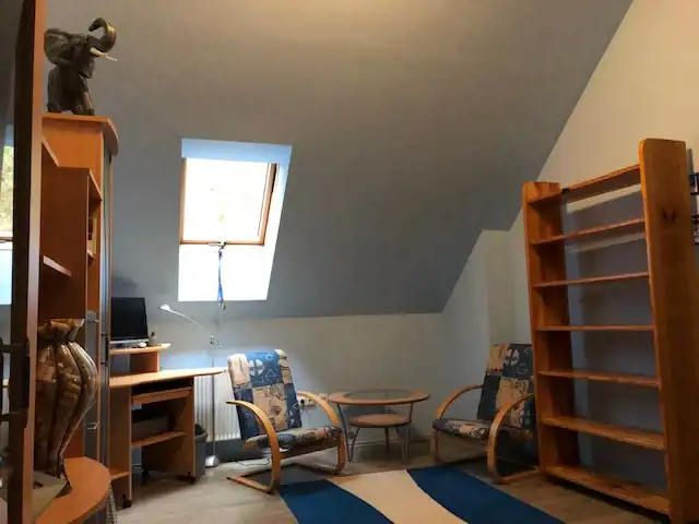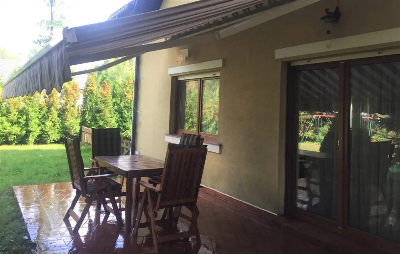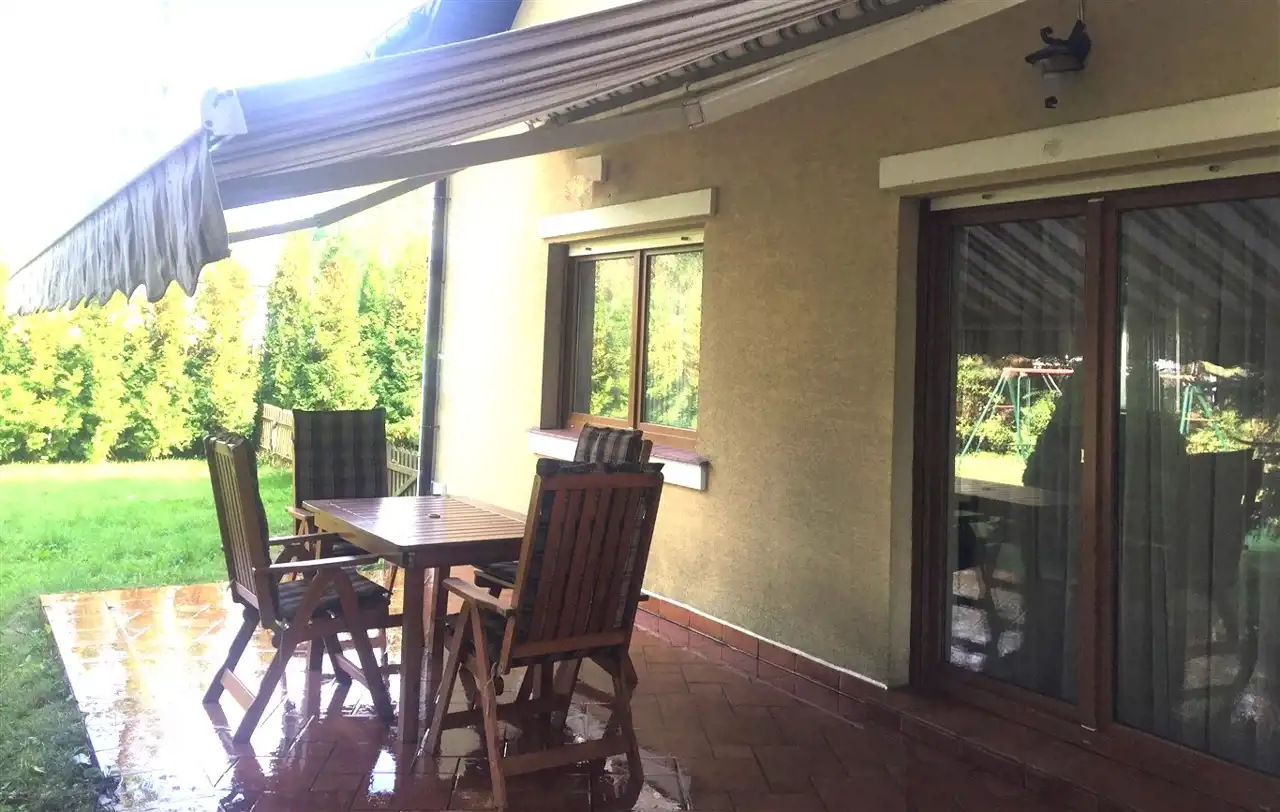 Budynek parterowy z użytkowym poddaszem ( połowa bliźniaka) z dużym tarasem ziemnym z markizą, garaż na 1 samochód, działka zagospodarowana. Całkowicie umeblowany.