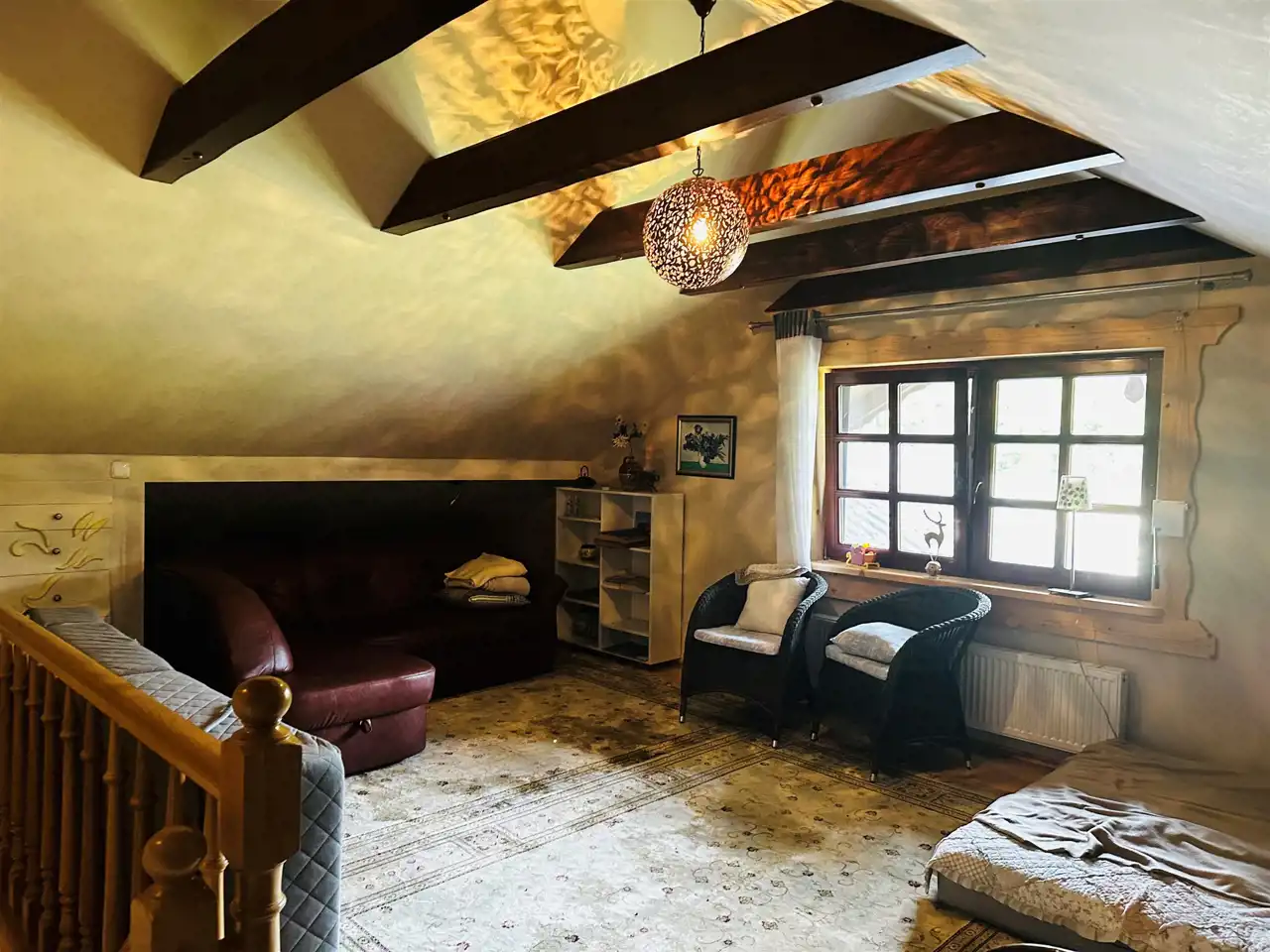 *poddasze:otwarta przestrzeń stanowiąca pokój dzienny/sypialnia oraz łazienka z wanną z hydromasażem -łącznie 25,56mkw.