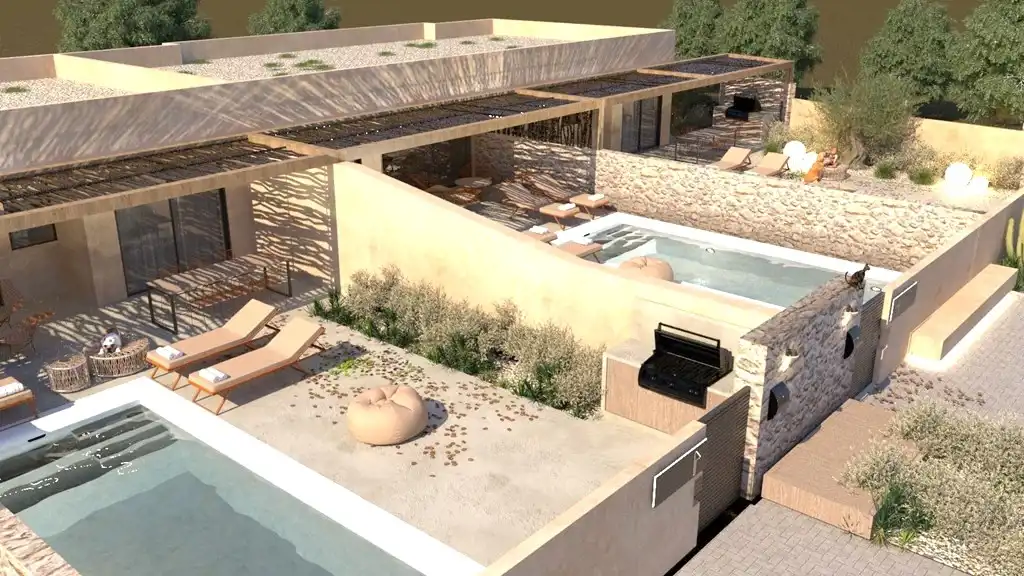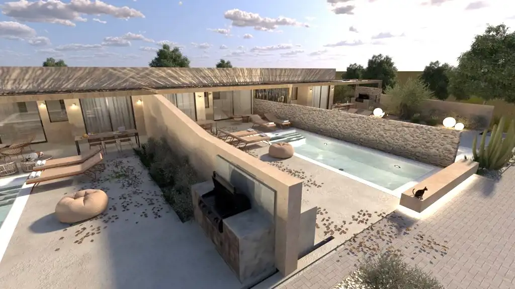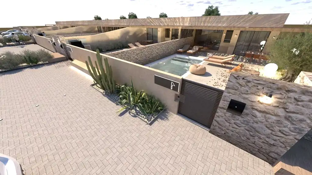 Posiada również w pełni zagospodarowany teren zewnętrzny, z prywatnym basenem, prywatnym parkingiem na 2 samochody i bogatą plantacją.