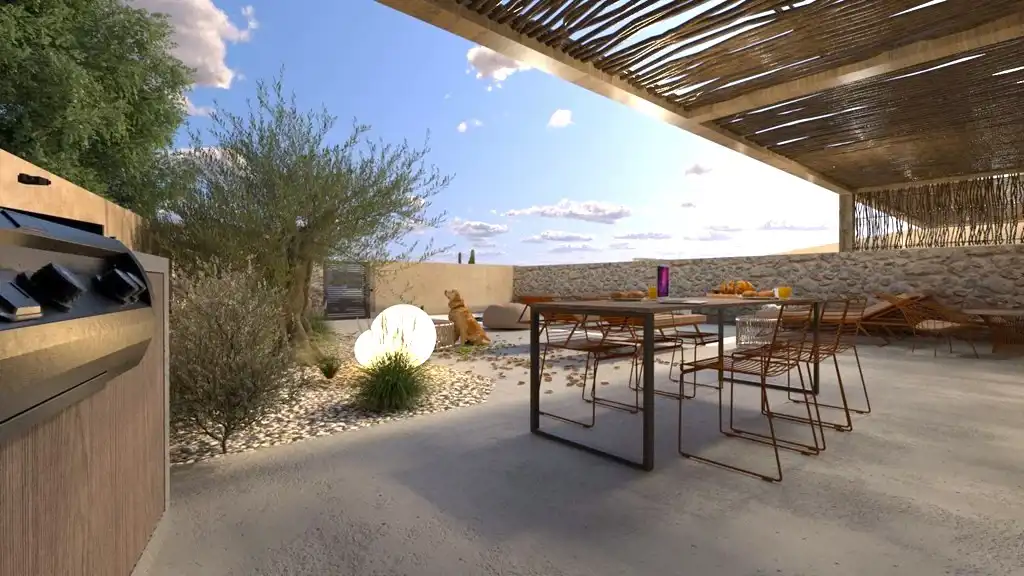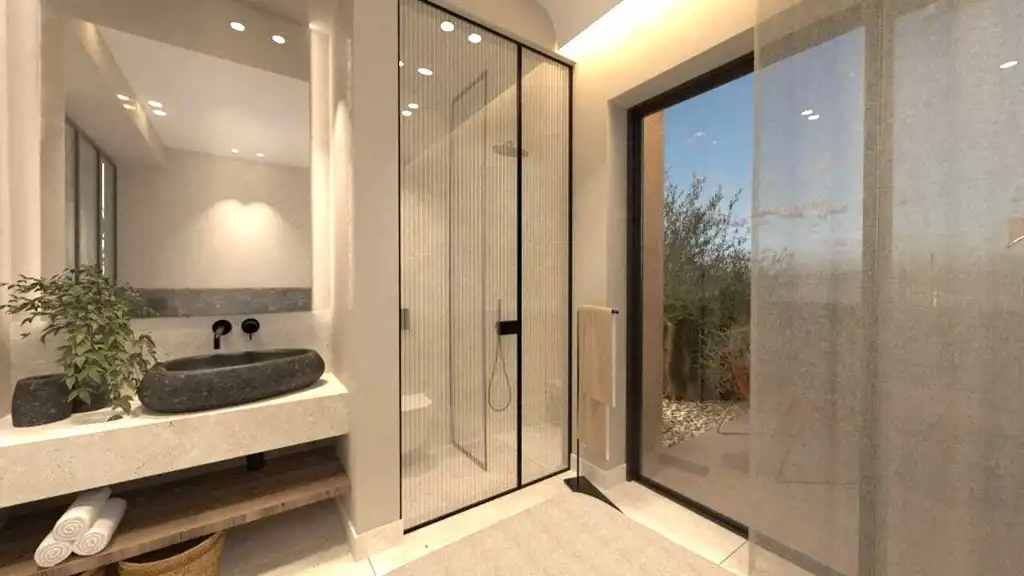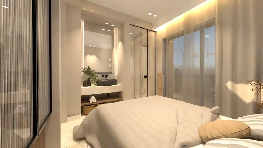 Dwie sypialnie, z których każda ma własną toaletę z prysznicem i otwartą przestrzeń składającą się z kuchni, jadalni i części wypoczynkowej. Kuchnia jest sercem tego domu i naturalnie wpada do ogrodu, oferując idealny styl życia wewnątrz/na zewnątrz.