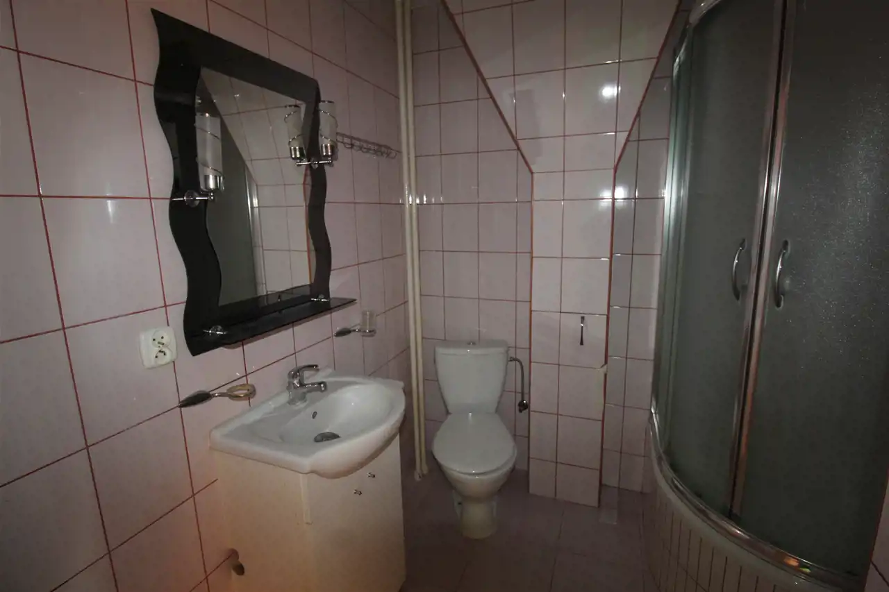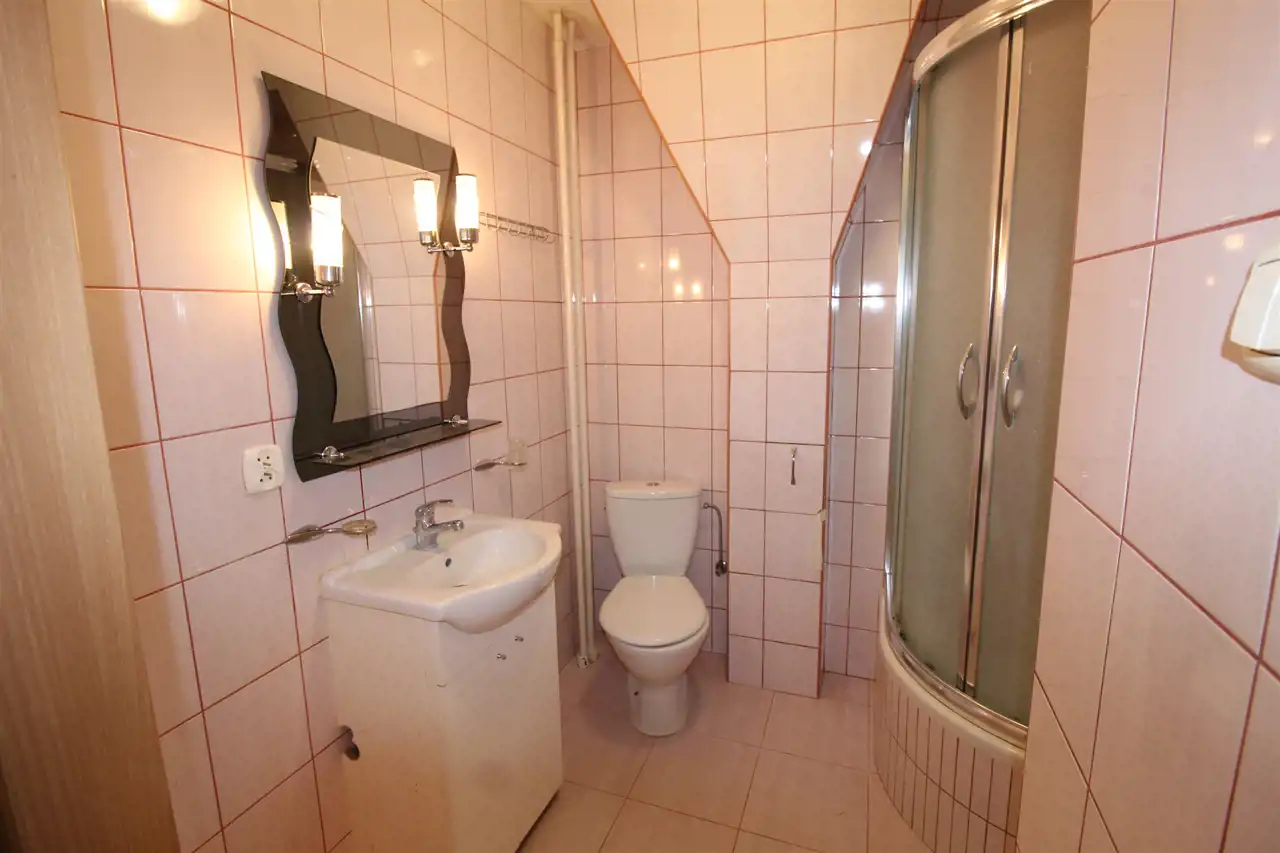obecnie w łazience znajduje się kabina prysznicowa, wc, umywalka z szafką i baterią,