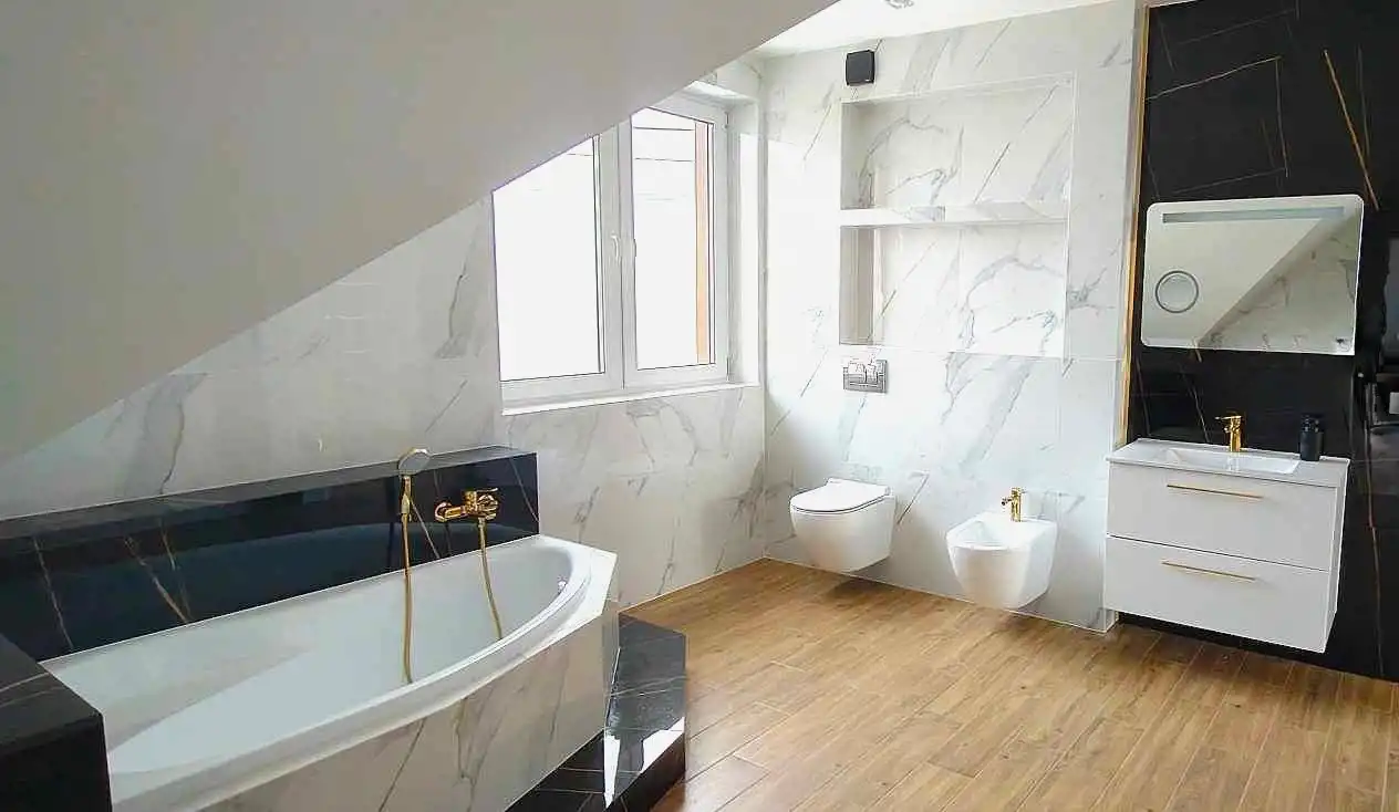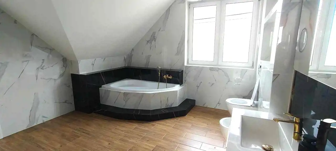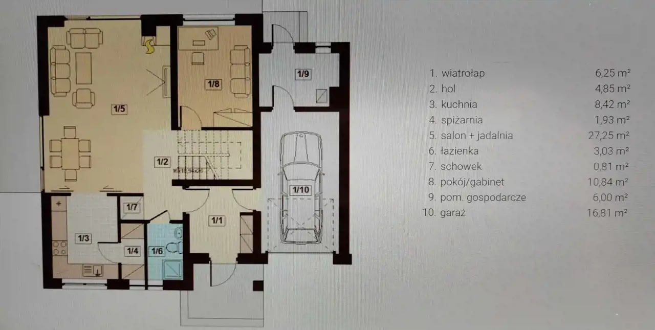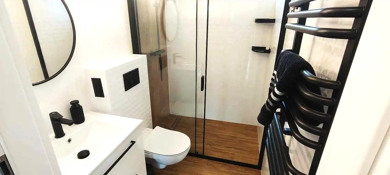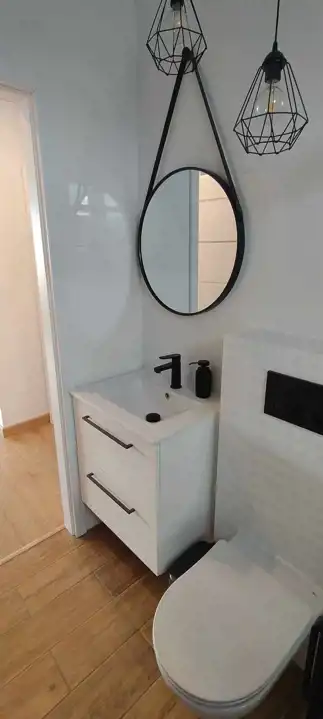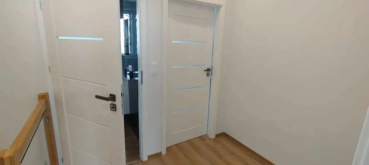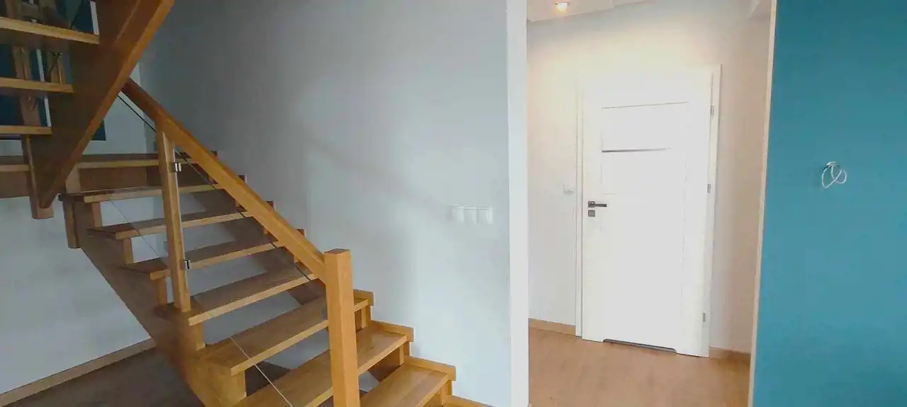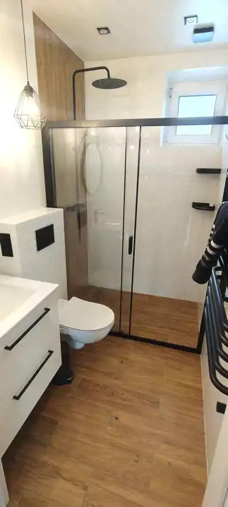 Poza tym na parterze znajduje się łazienka z dużym prysznicem/odpływ liniowy/ oraz wnęka na szafkę, za garażem jest kotłownia z wyjściem na zewnątrz.