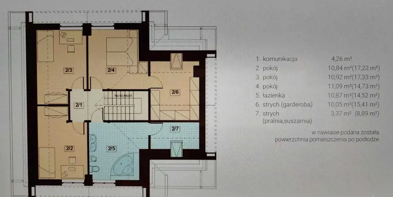 NA PODDASZU są trzy ustawne sypialnie, z czego jedna zawiera przejście do obszernej garderoby. Z korytarza dostępna jest łazienka (14,52m2 po podłodze) wykończona w wysokim standardzie i najnowszych trendach, duża wanna, okno i dodatkowo połączona jest z pralnią/garderobą (około 9 m2 po podłodze z oknem dachowym).