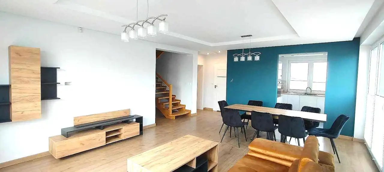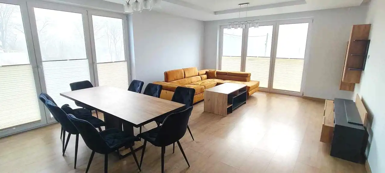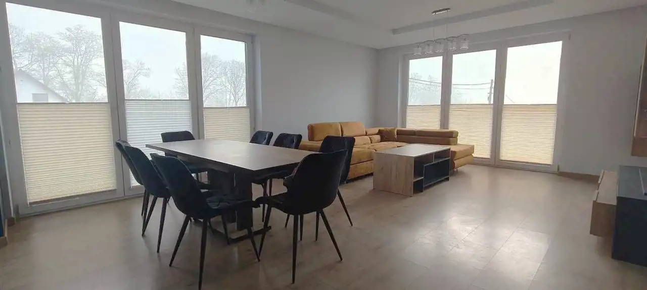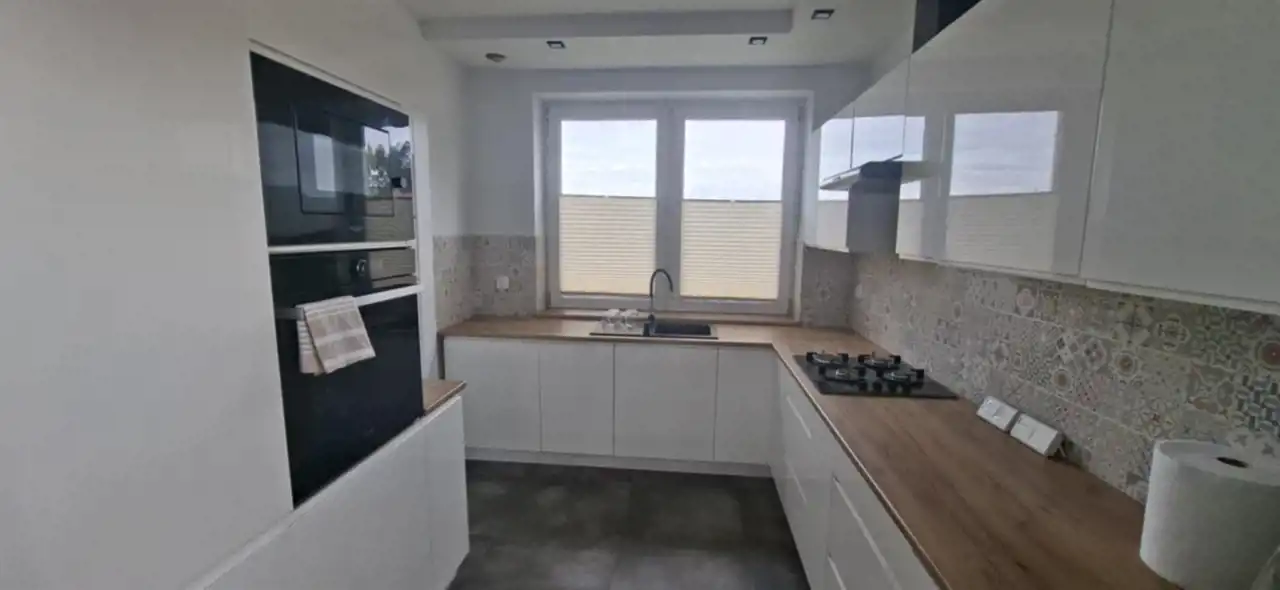 Urządzona i wyposażona kuchnia, łazienki i podłogi pokoi. Salon wyposażony w narożnik i regał, w jadalni duży stół z krzesłami. Taras i podjazd z kostki, ogrzewanie podłogowe + piec z 120l zbiornikiem, ogrodzenie z bramą i furtka, duży plac przed ogrodzeniem jako dodatkowe miejsca parkingowe. BARDZO MILI SĄSIEDZI, obok tereny rekreacyjne, dużo terenów spacerowych, stawy i ogródki działkowe, Pobiednik- widok na spadochrony i samoloty ..