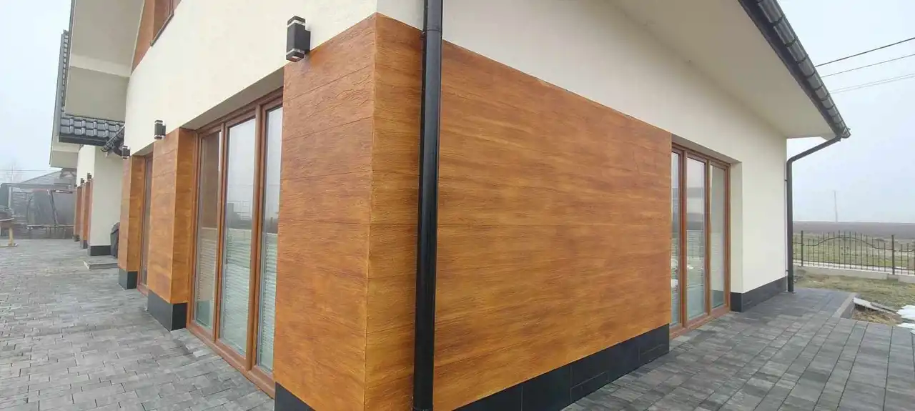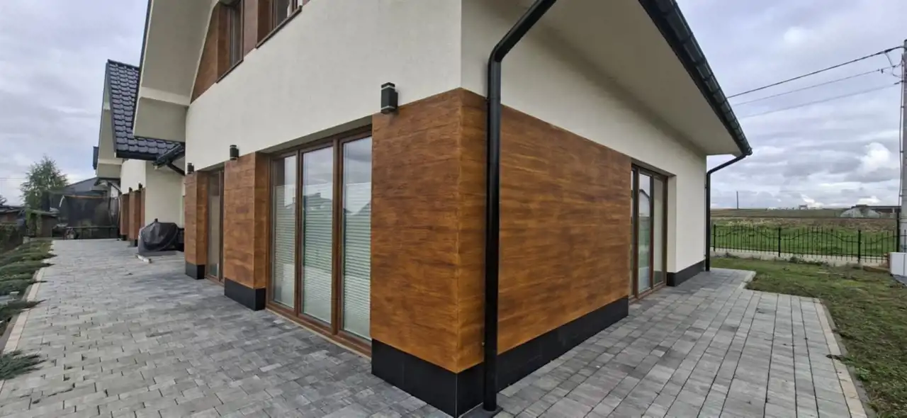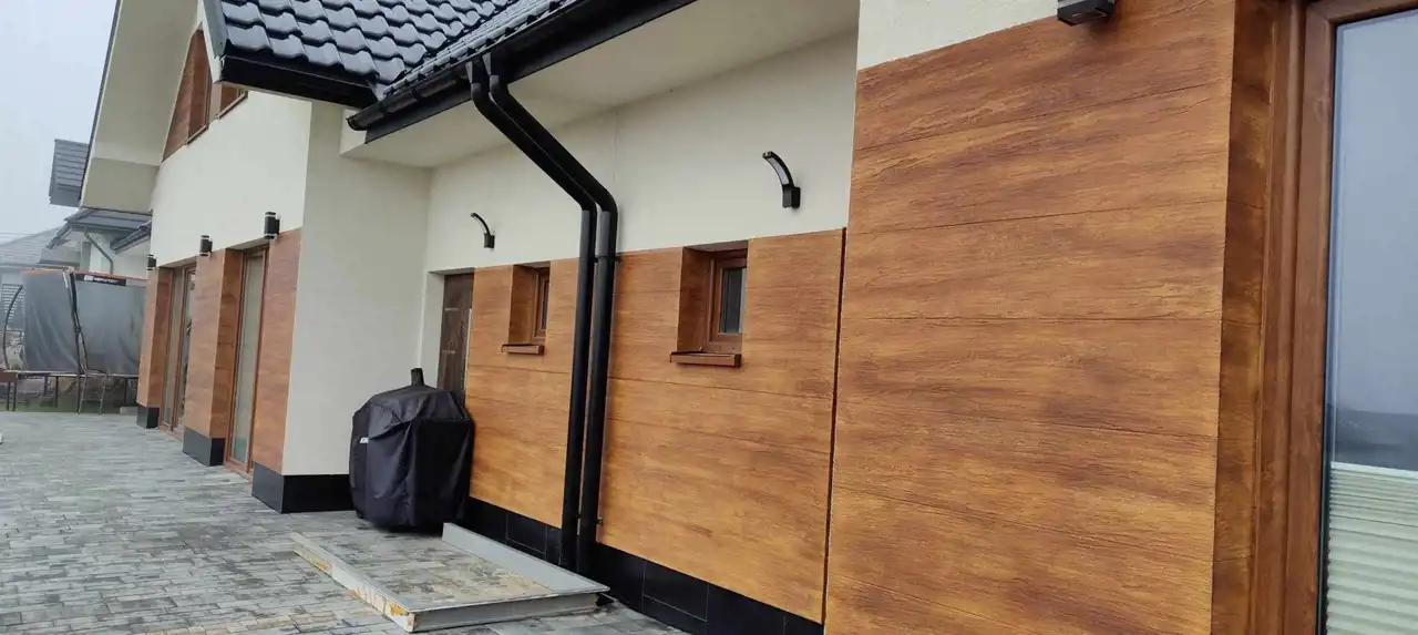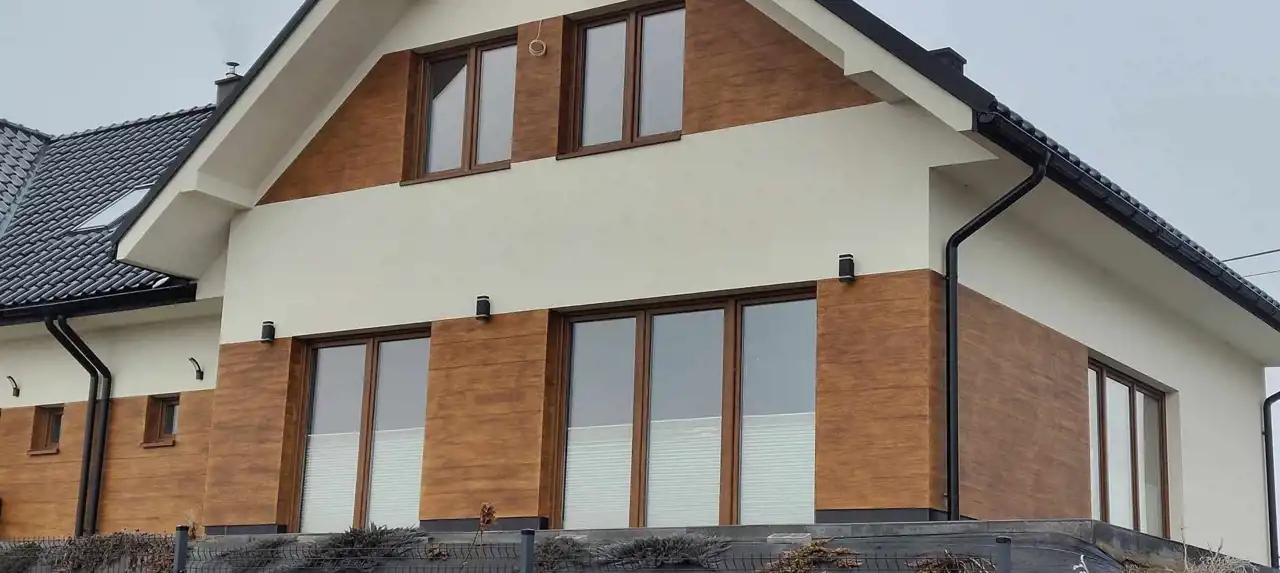 Dom prezentuje się elegancko ze względu na gustowne połączenie materiałów wykończeniowych. Białe ściany tynkowe urozmaicono wstawkami w kolorze ciepłego odcienia drewnianej deski.