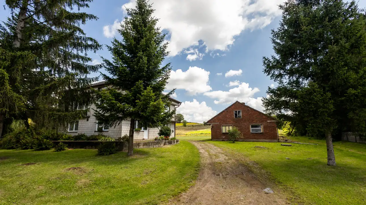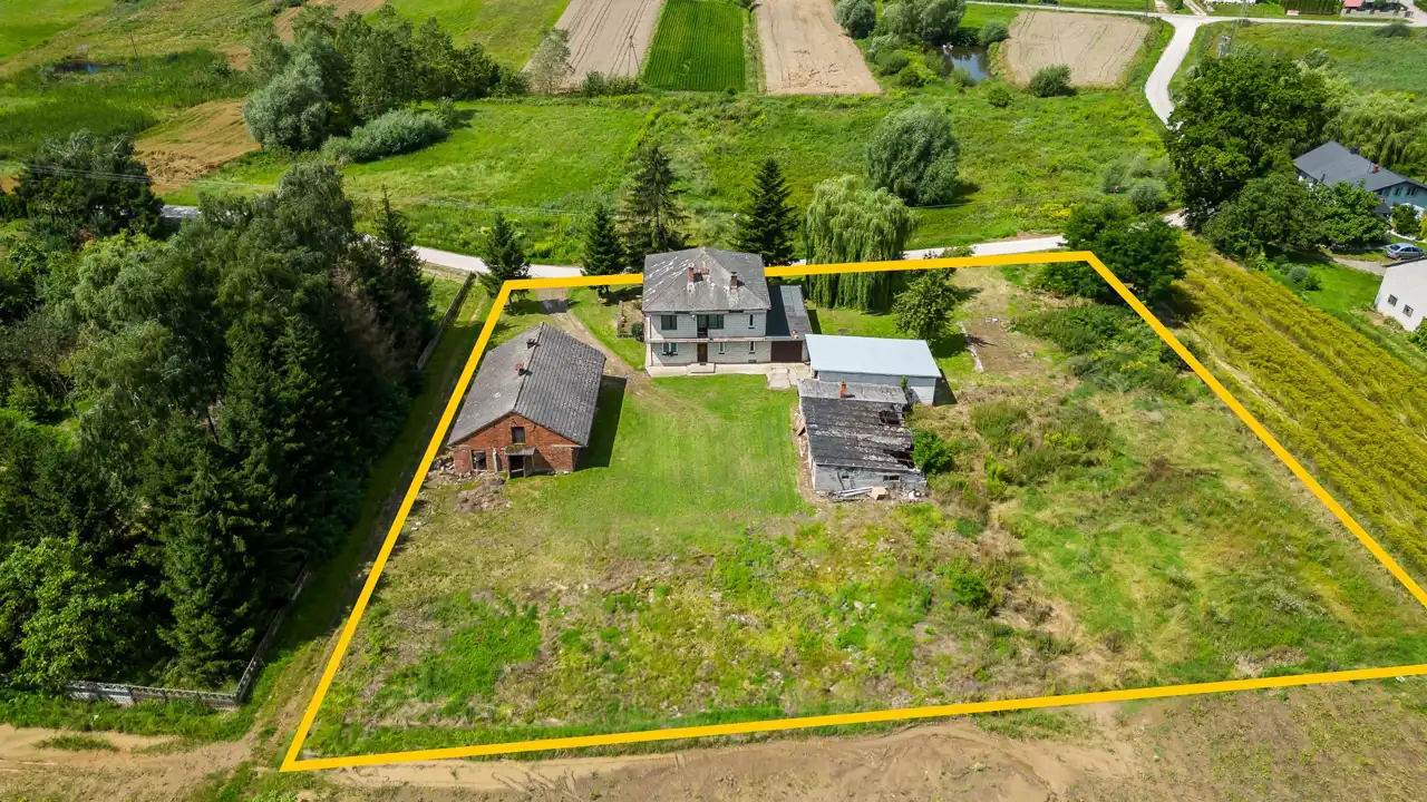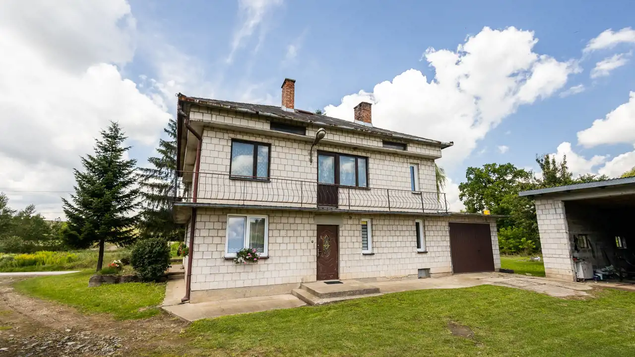 Dom wolnostojący, 2-kondygnacyjna z lat 90-tych XX w., o pow. całkowitej 222,79 m2, z garażem w bryle budynku oraz obok, stary dom z cegły o pow. ok. 110 m2, posadowiony na działce o pow. 0,46 ha, z bezpośrednim dostępem do drogi publicznej.