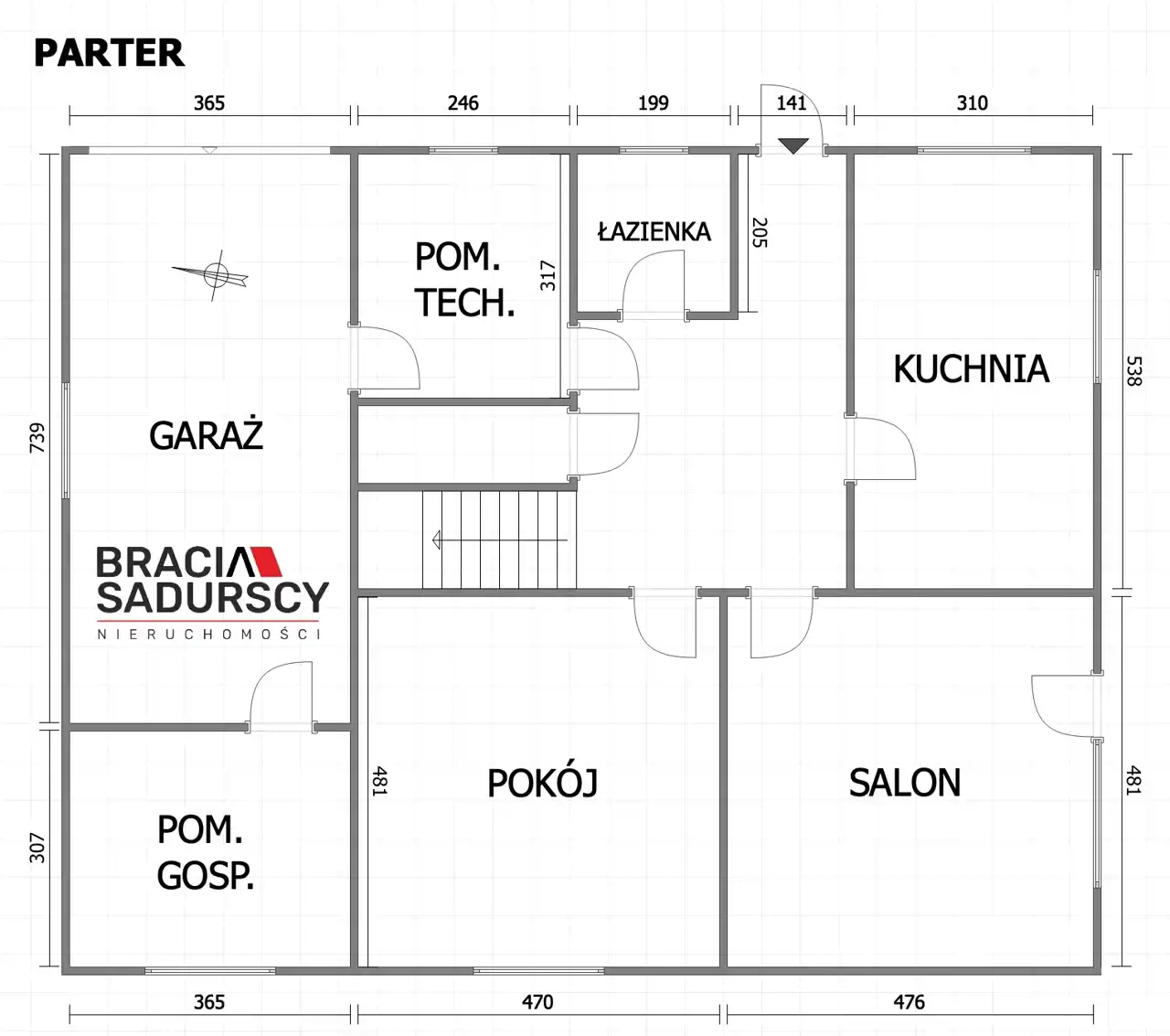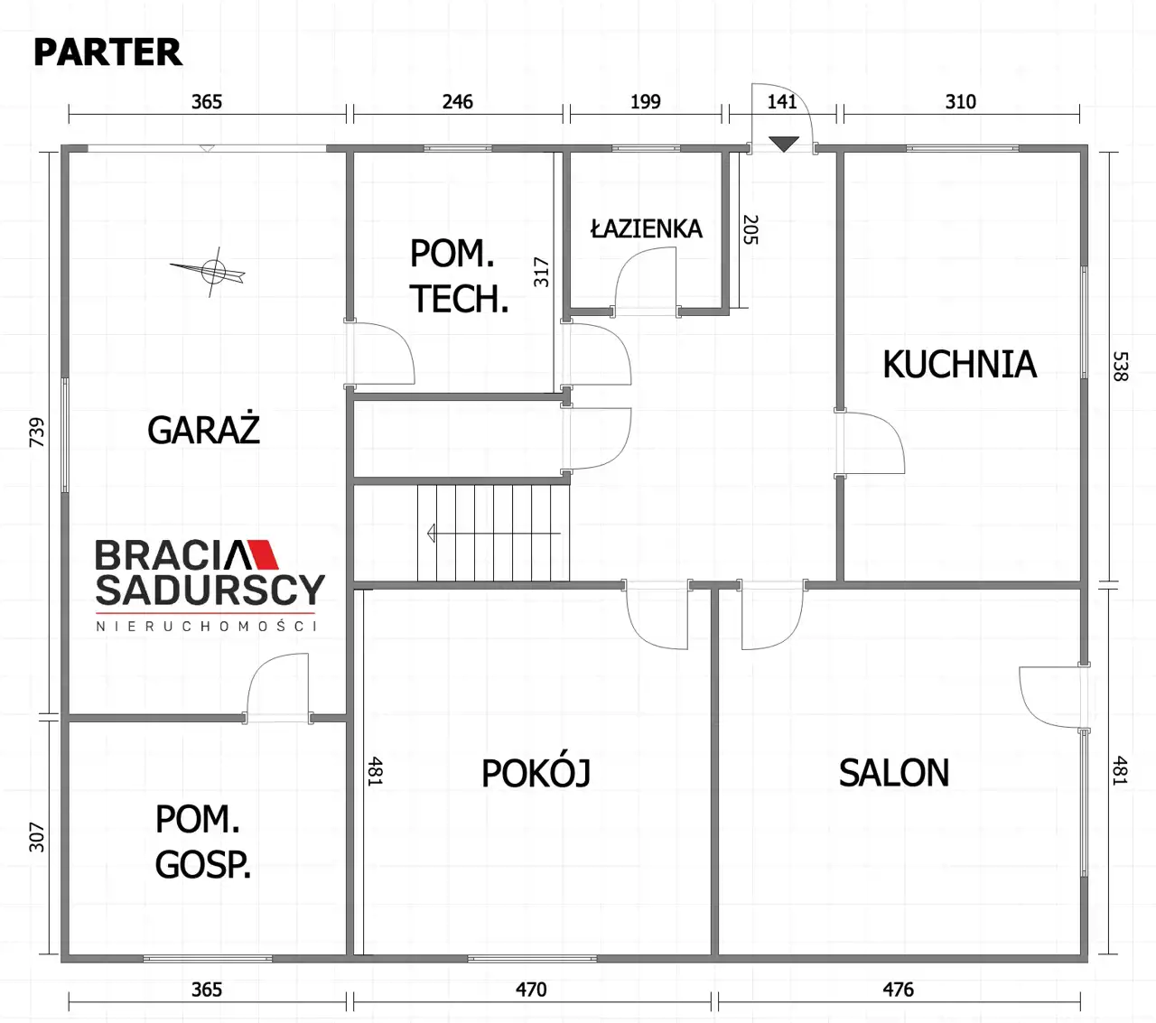 Parter budynku o pow. 136,14 m2, zawiera: 2 pokoje (22,6 m2, 22,9 m2), osobną kuchnię (16,6 m2), łazienkę (4,08 m2), garaż (27,0 m2), pomieszczenie gospodarcze (11,2 m2), kotłownię (7,8 m2) oraz przedpokój.